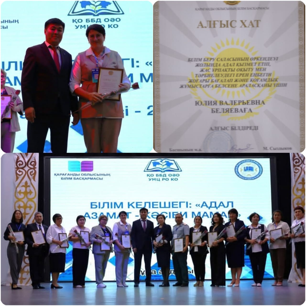 "Благодарственное письмо" управления образования Карагандинской области Беляевой Юлии Валерьевне