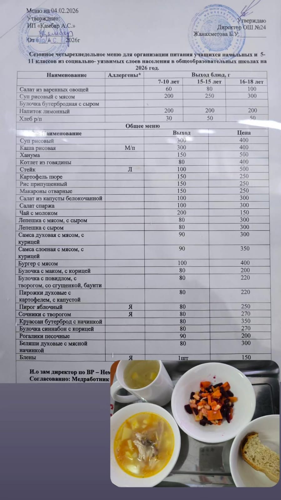 2025 жылғы 24 қазандағы азық-түлік сапасын тексеру кезінде комиссия (құрамында әкімшілік, медицина қызметкері және жұртшылық) дайындалған тағам көлемі студенттер санына толығымен сәйкес келетінін растады. Сынақ бөліктерінің салмағы стандарттарға сәйкес келеді және сандық көрсеткіштерге қатысты алаңдаушылық жоқ