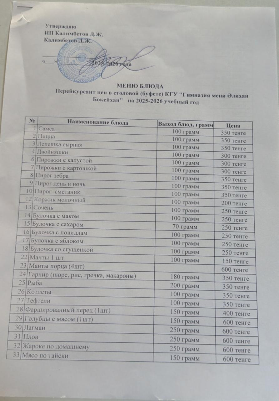 Әлихан Бөкейхан атындағы гимназиясының ас мәзірі!