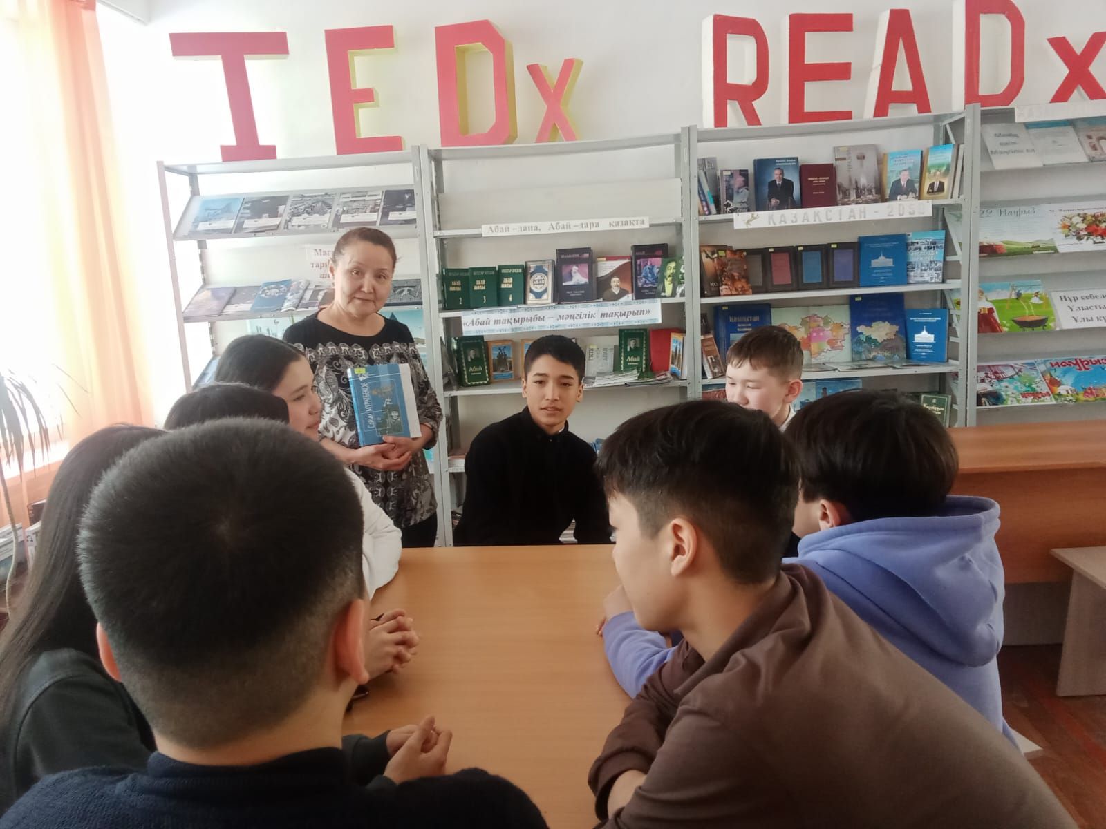 В школьной библиотеке в рамках проекта «Жажду учиться в школу» 7-классники прочитали и разобрали «Дикое яблоко» С. Муратбекова по республиканскому челленджу «Моя любимая…