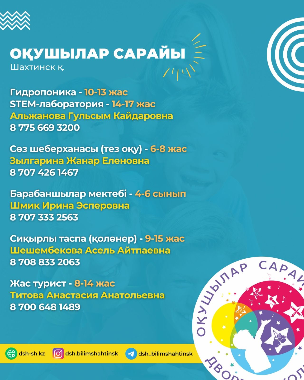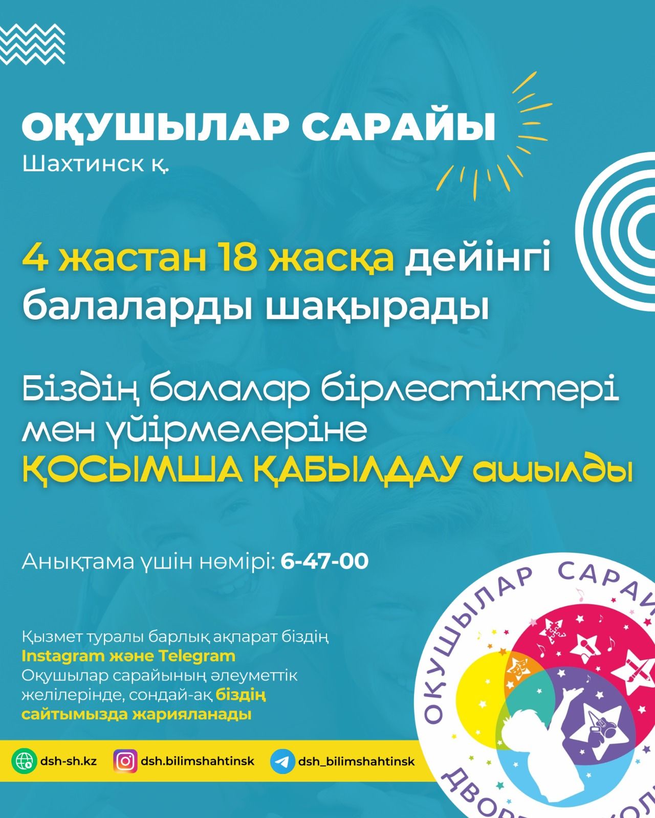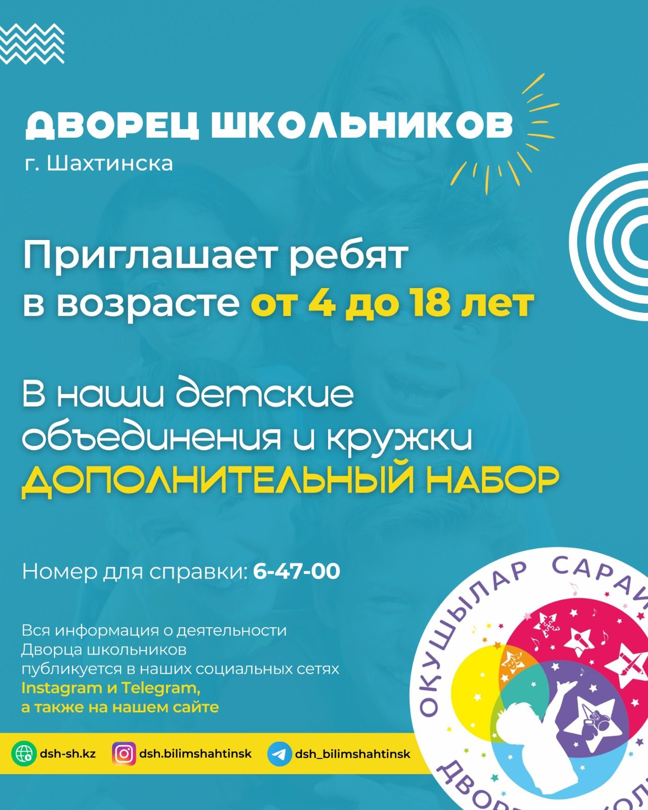 Оқушылар сарайы балалар үйірмелері мен секцияларына қабылдауды ашады. 4 жастан 18 жасқа дейінгі балалар шақырылады. анықтамалар үшін телефон 6-47-00
