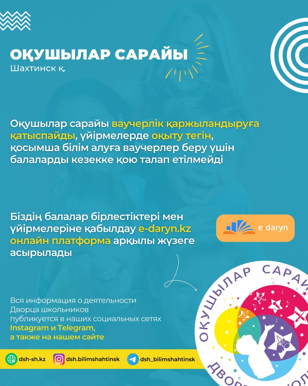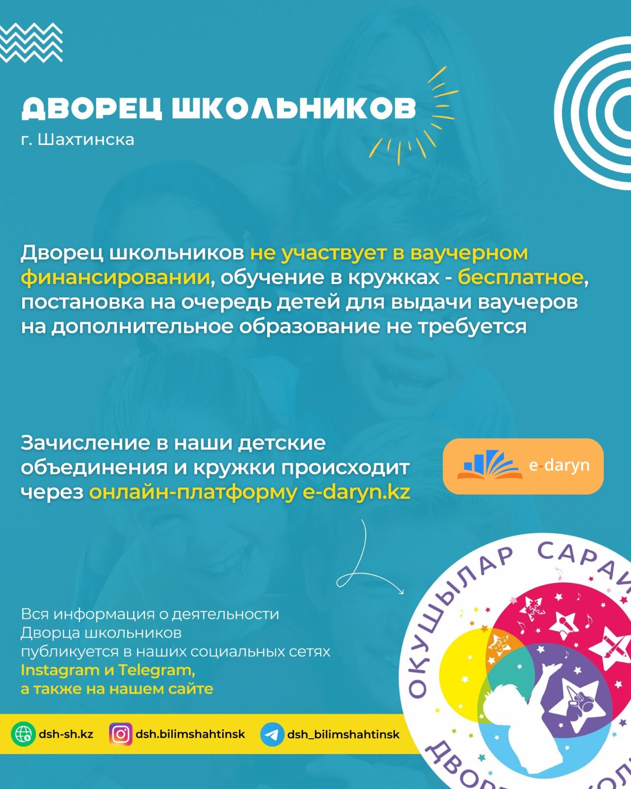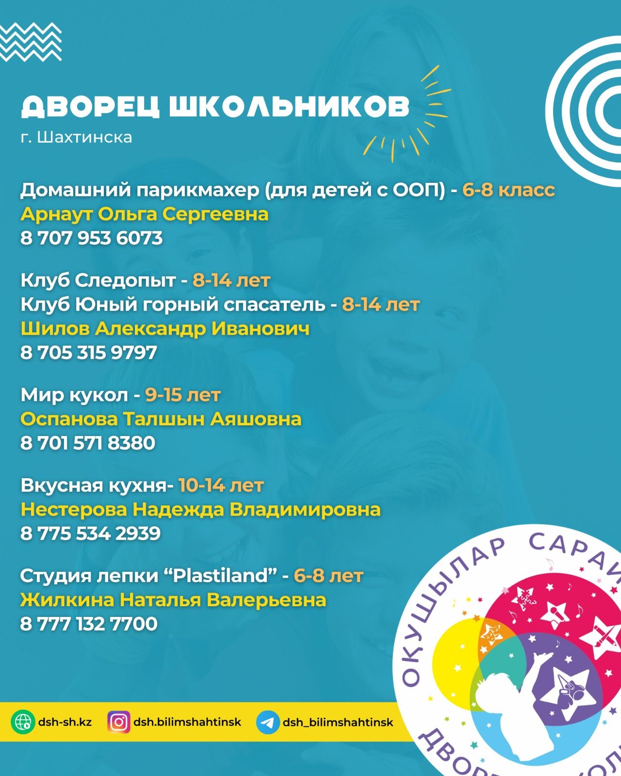Оқушылар сарайы балалар үйірмелері мен секцияларына қабылдауды ашады. 4 жастан 18 жасқа дейінгі балалар шақырылады. анықтамалар үшін телефон 6-47-00