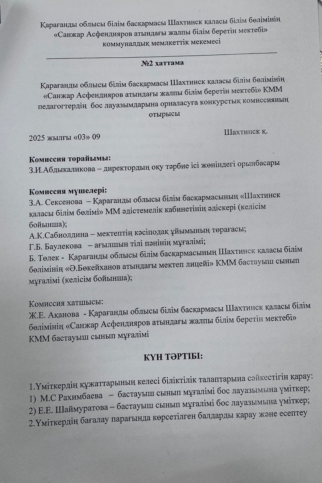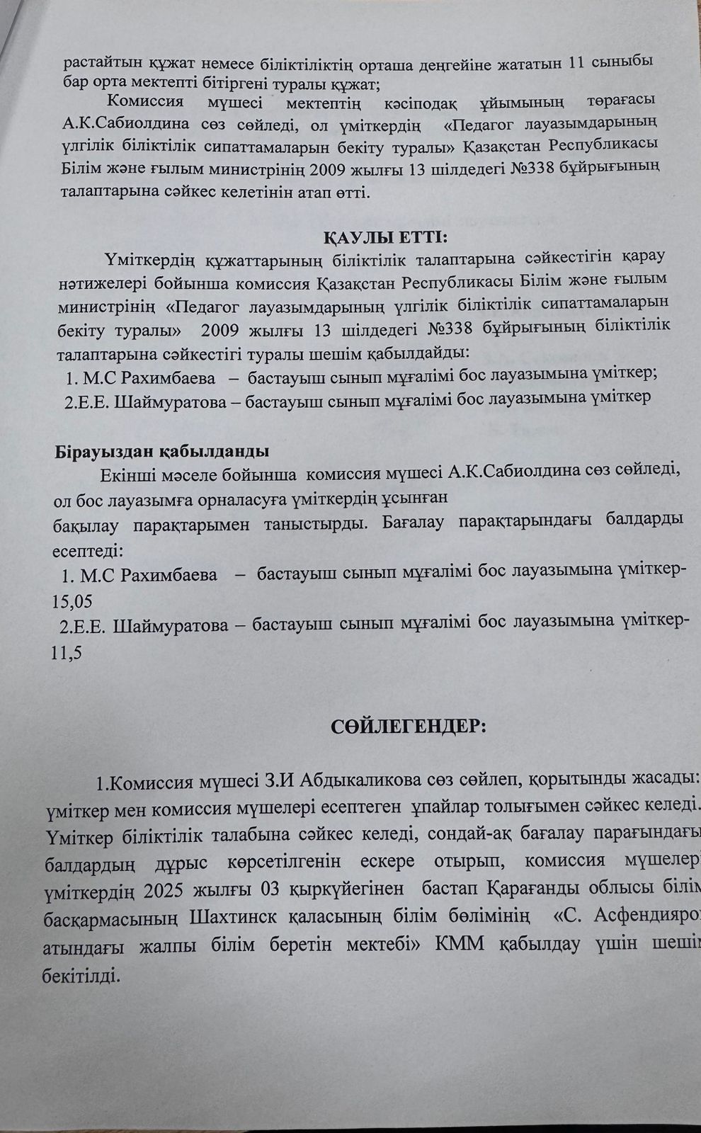 — Информатизация жөніндегі директор орынбасары – 1 жүктеме — Физика пәні мұғалімі – 1 жүктеме (декреттік демалыс орнына) — Тәрбие ісі жөніндегі директор орынбасары &nda…