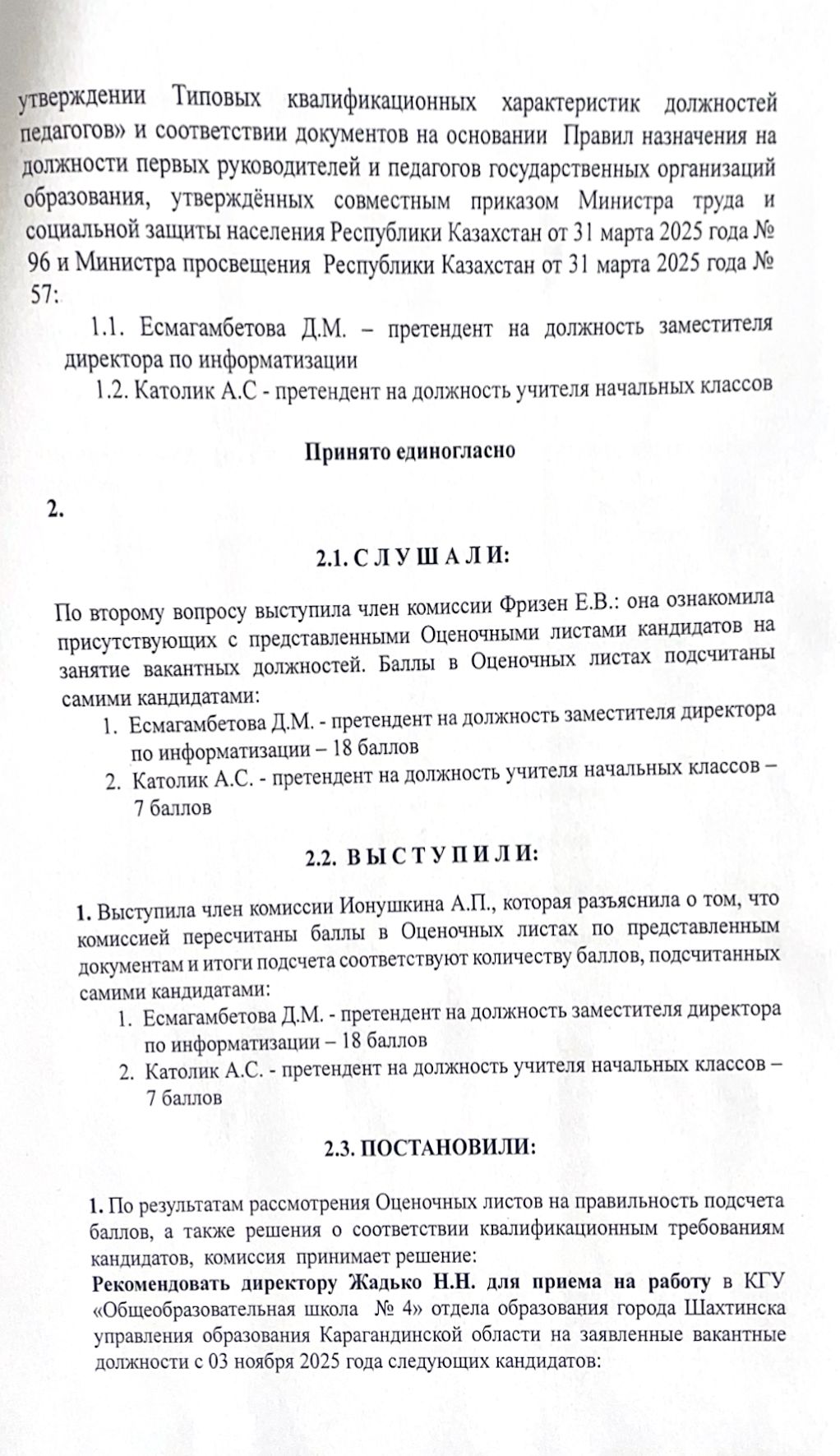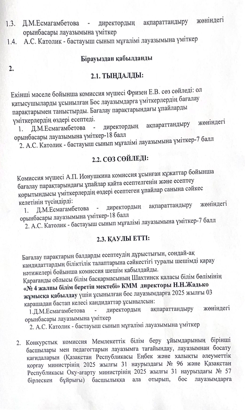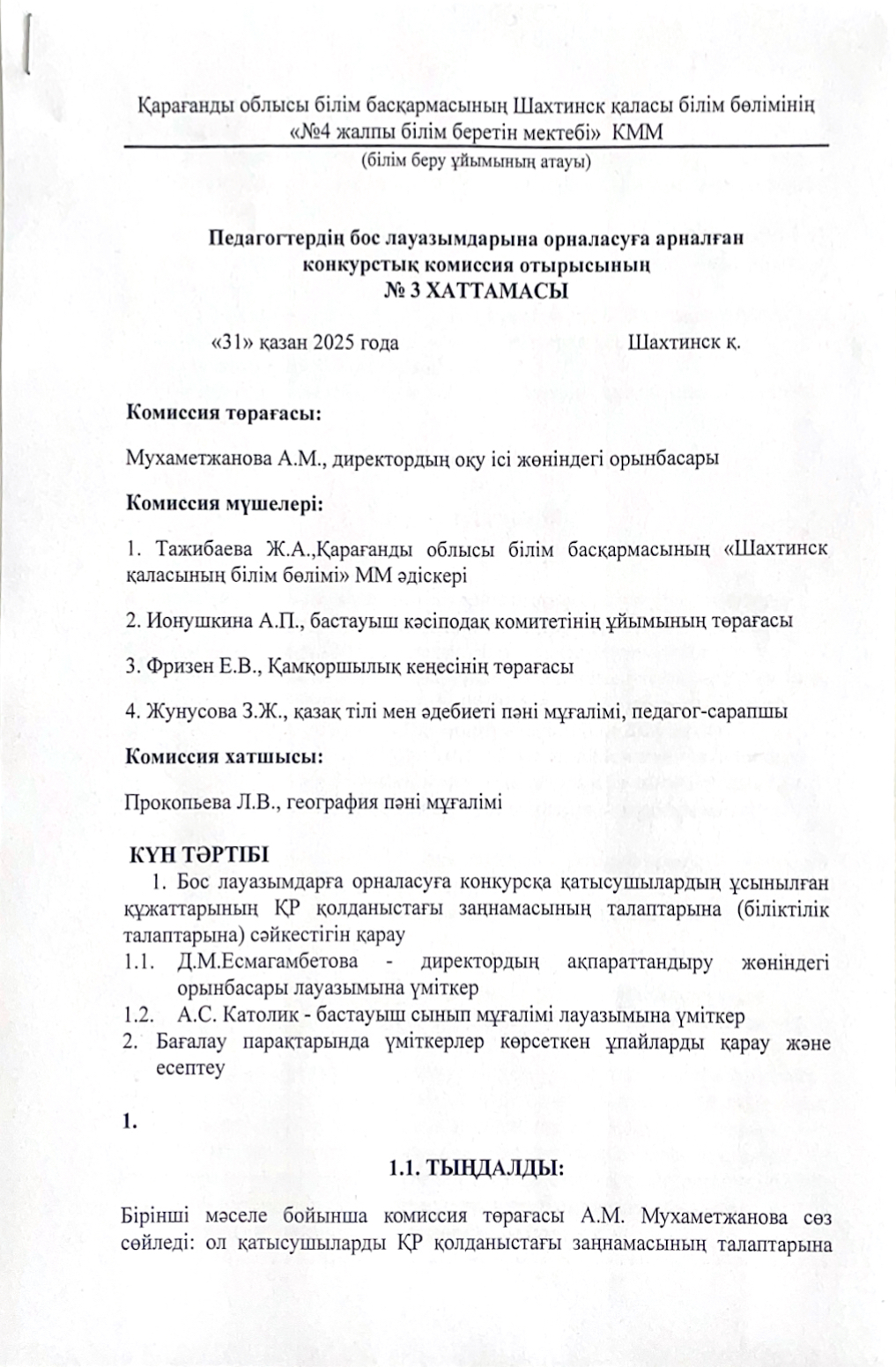 Педагогтердін бос лауазымдарына орналасуга конкурстык комиссия отырысынын Nº 4 ХАТТАМАСЫ