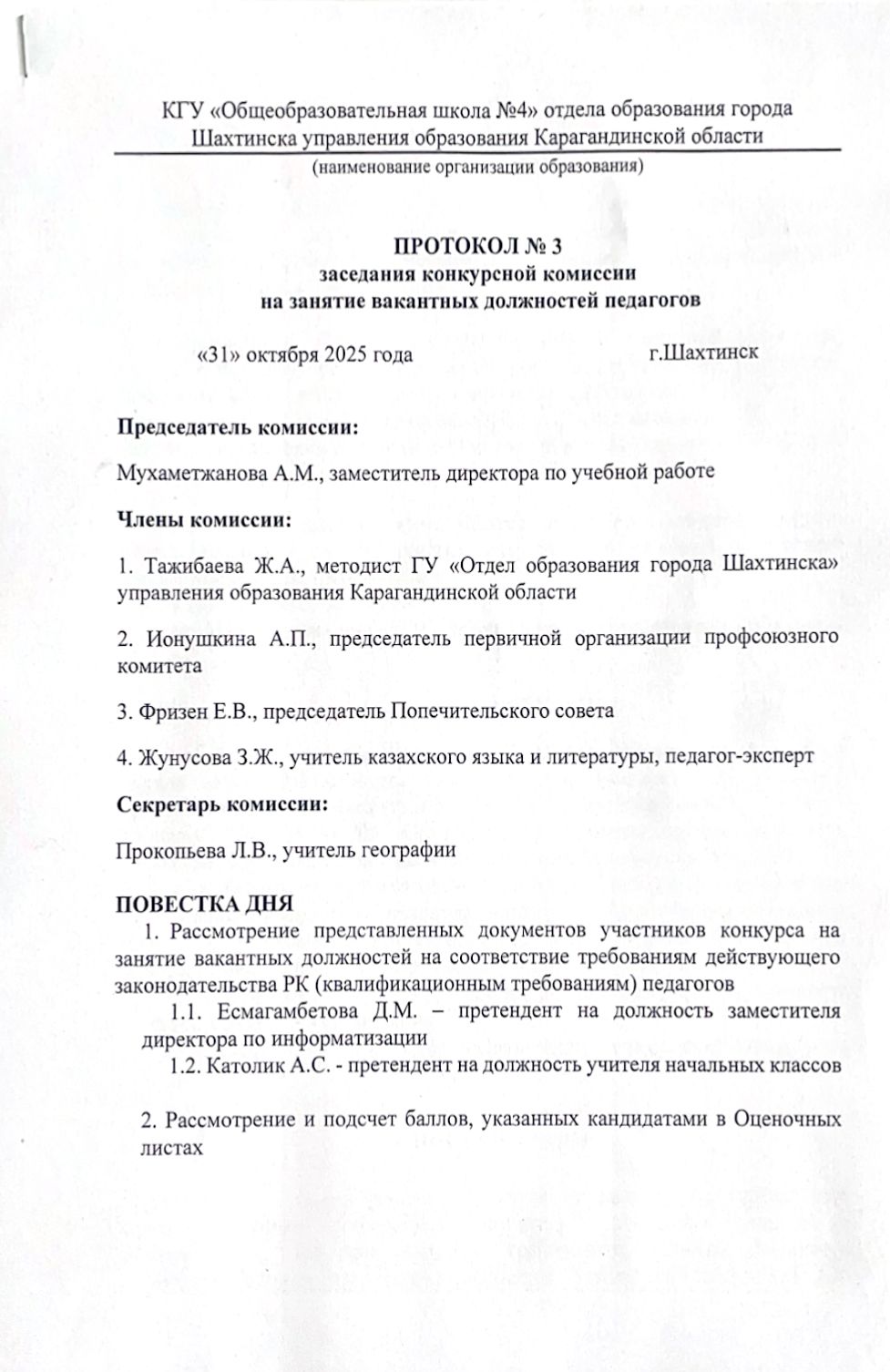 ПРОТОКОЛ Nº 4 заседания конкурсной комиссии на занятие вакантных должностей педагогов