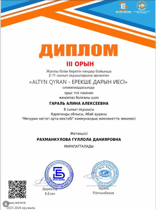 ДИПЛОМ ІІІ МЕСТО По общеобразовательным предметам Для учащихся 2-11 классов «ALTYN QYRAN-ОБЛАДАТЕЛЬ ОСОБОГО ТАЛАНТА» на Олимпиаде по русскому языку ЖУМАНОВА СТЕФАНИЯ МИХАЙЛОВНА &…