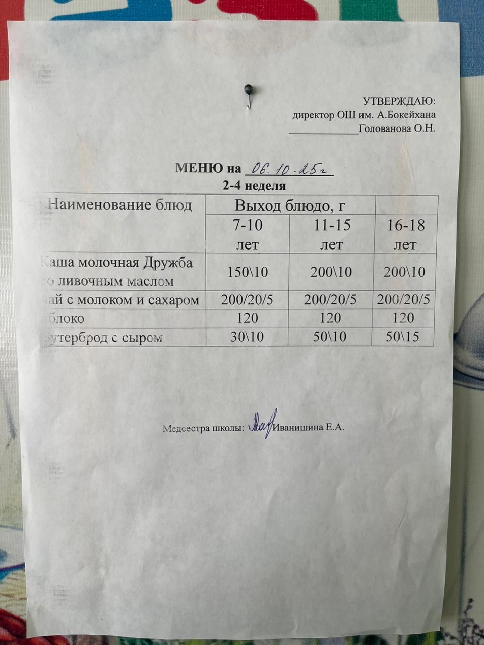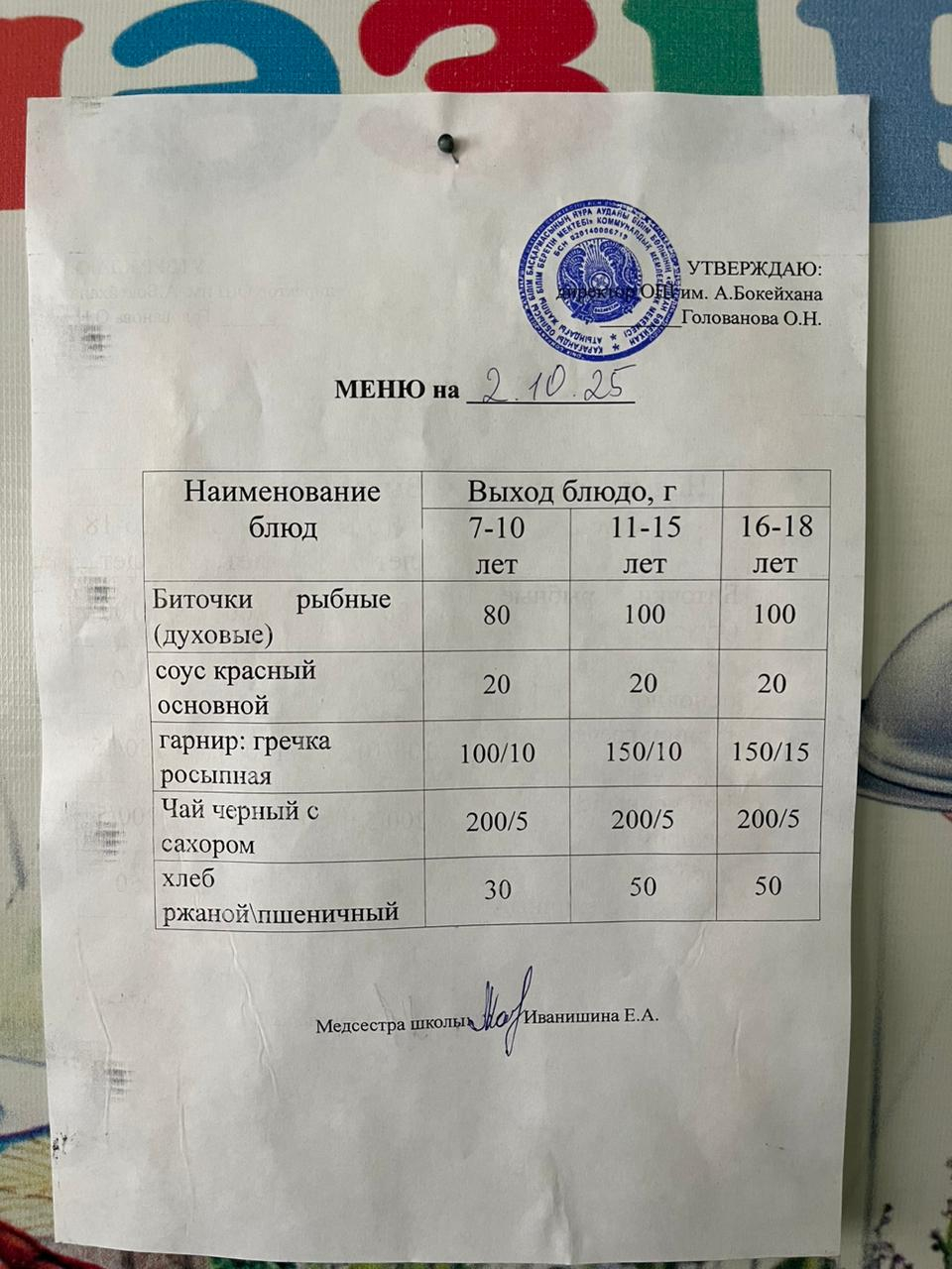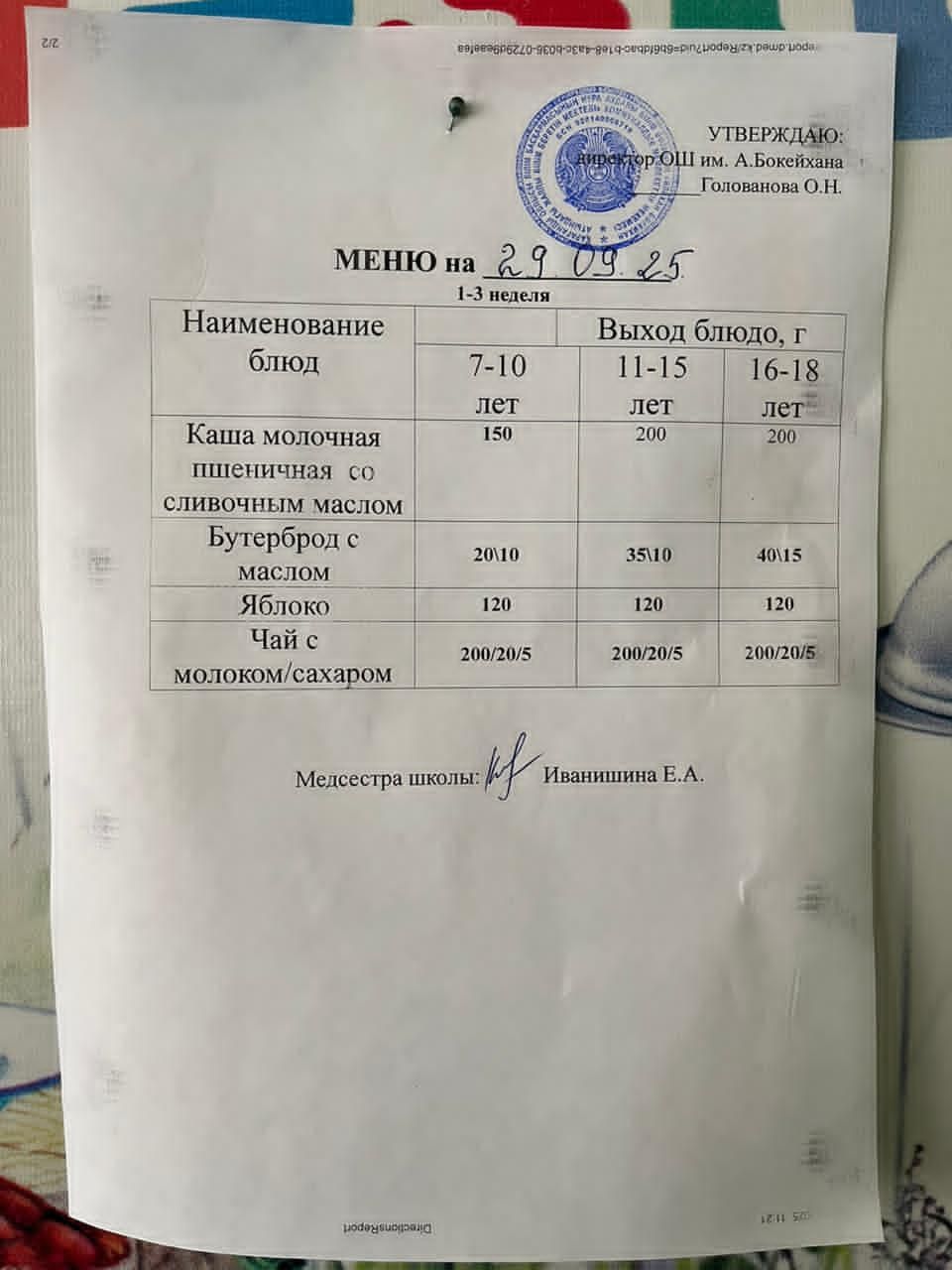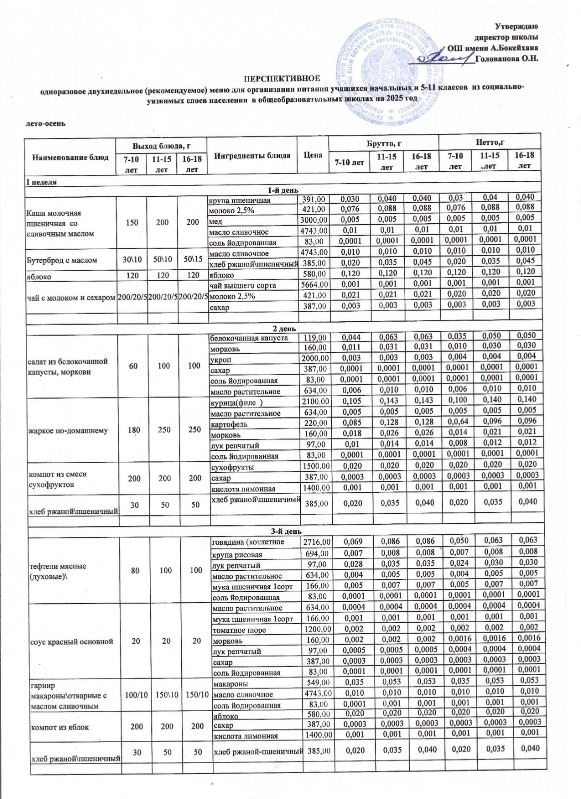 Перспективное двухнедельное меню блюд для организации питания учащихся начальных классов а также 5-11 классов в КГУ ОШ им Алихана Бокейхана 2024-2025 учебный год