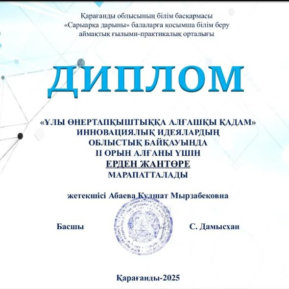 «Сарыарқа дарыны» балаларға қосымша білім беру аймақтық ғылыми-практикалық орталығының ұйымдастыруымен қашықтықтан ИННОВАЦИЯЛЫҚ ИДЕЯЛАРДЫҢ ОБЛЫСТЫҚ БАЙҚАУЫ өтті.
