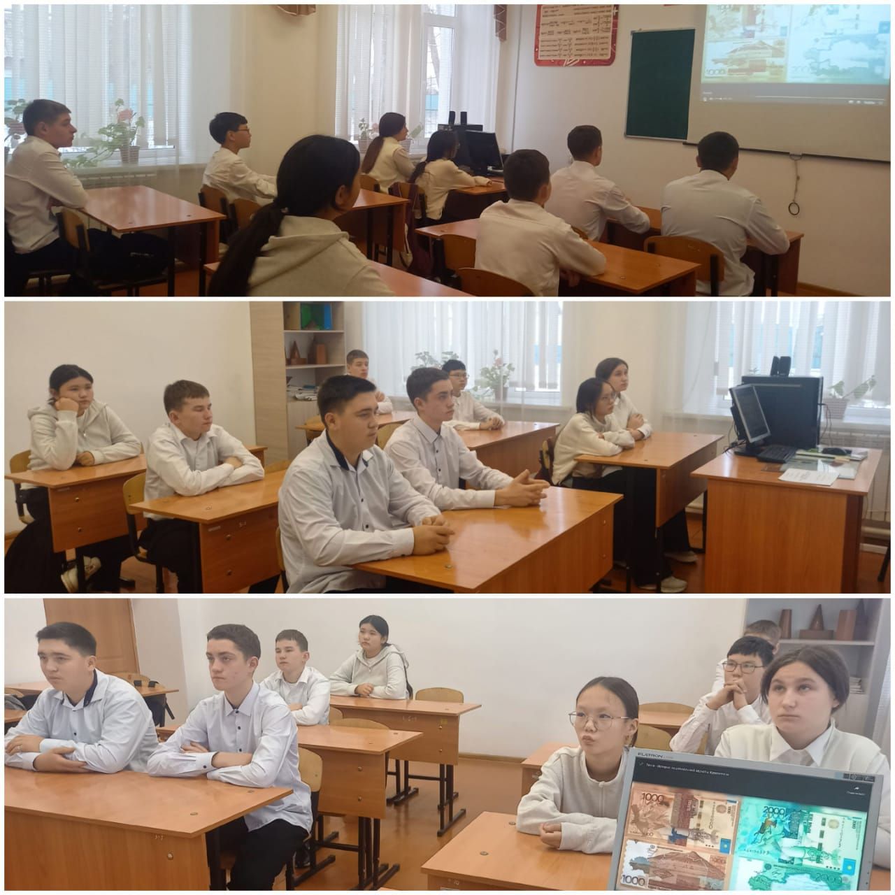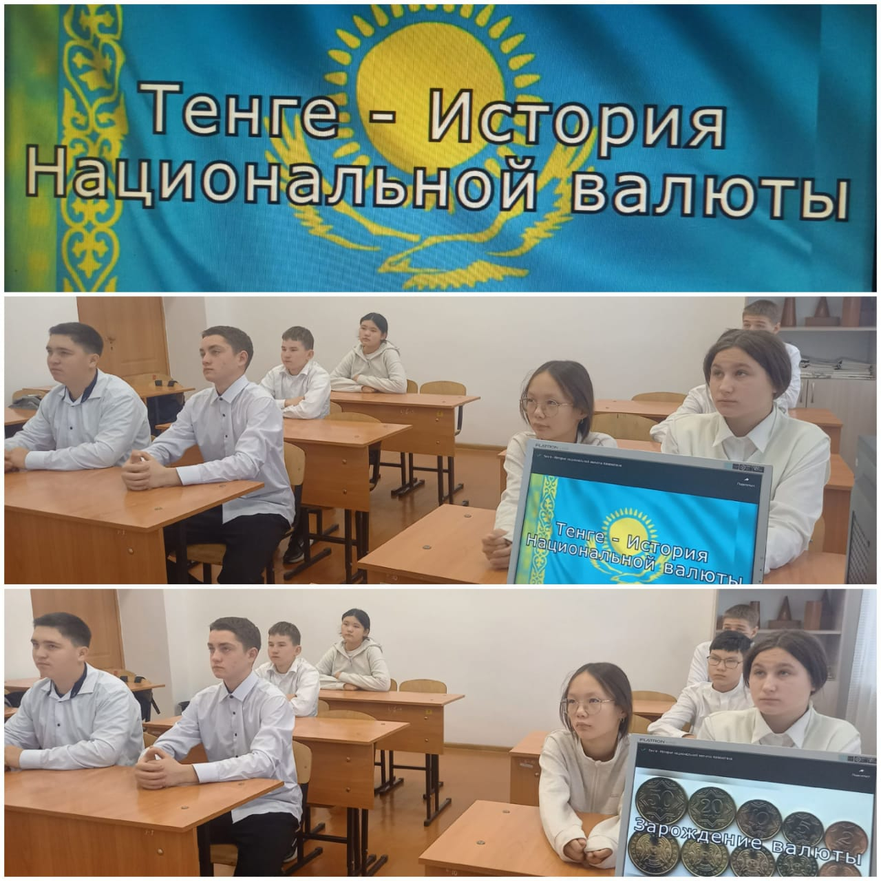 10.01.2025 года в ОШ имени К.Мынбаева, классный руководитель 9"Б" класса, Есенова Г.К, провела классный час на тему:"Тенге-опора Независимости".Цель: