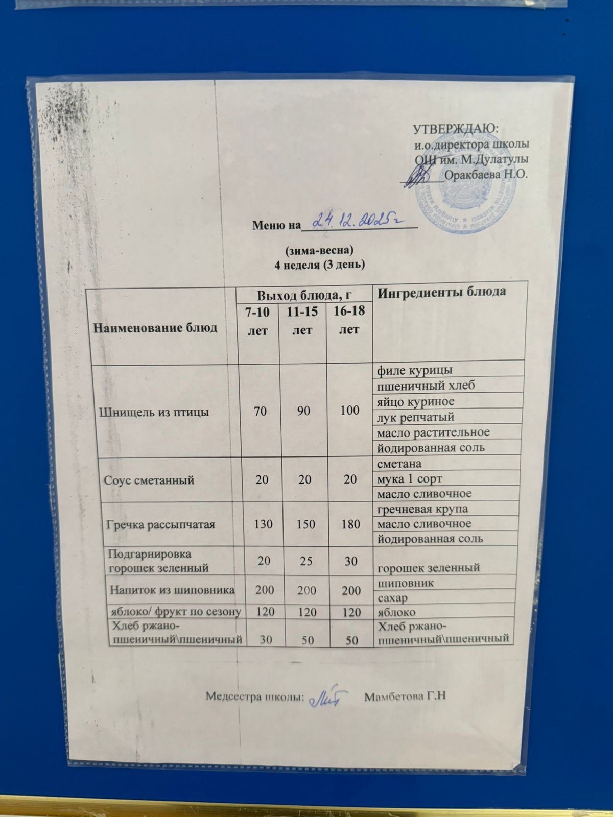 2025 жылдың 24 желтоқсан күні мектеп оқушыларына арналған күнделікті тамақтану райионы төмендегідей ұйымдастырылды.