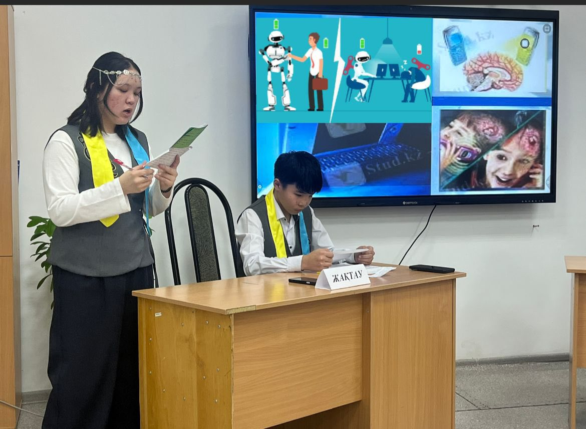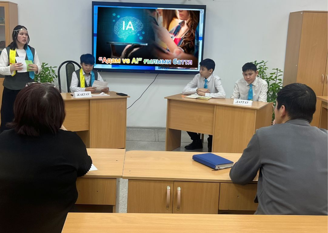 Ақпараттық және компьютерлік сауаттылықты дамыту апталығының 4-ші күні. “Адам vs AI” ғылыми баттлы ұйымдастырылды. ???? Мақсаты: Міржақып Дулатұлы атындағы ЖББМ оқушылары арасында ұйымдастырылған “Адам vs AI” ғылыми баттлының басты мақсаты – білім алушыл