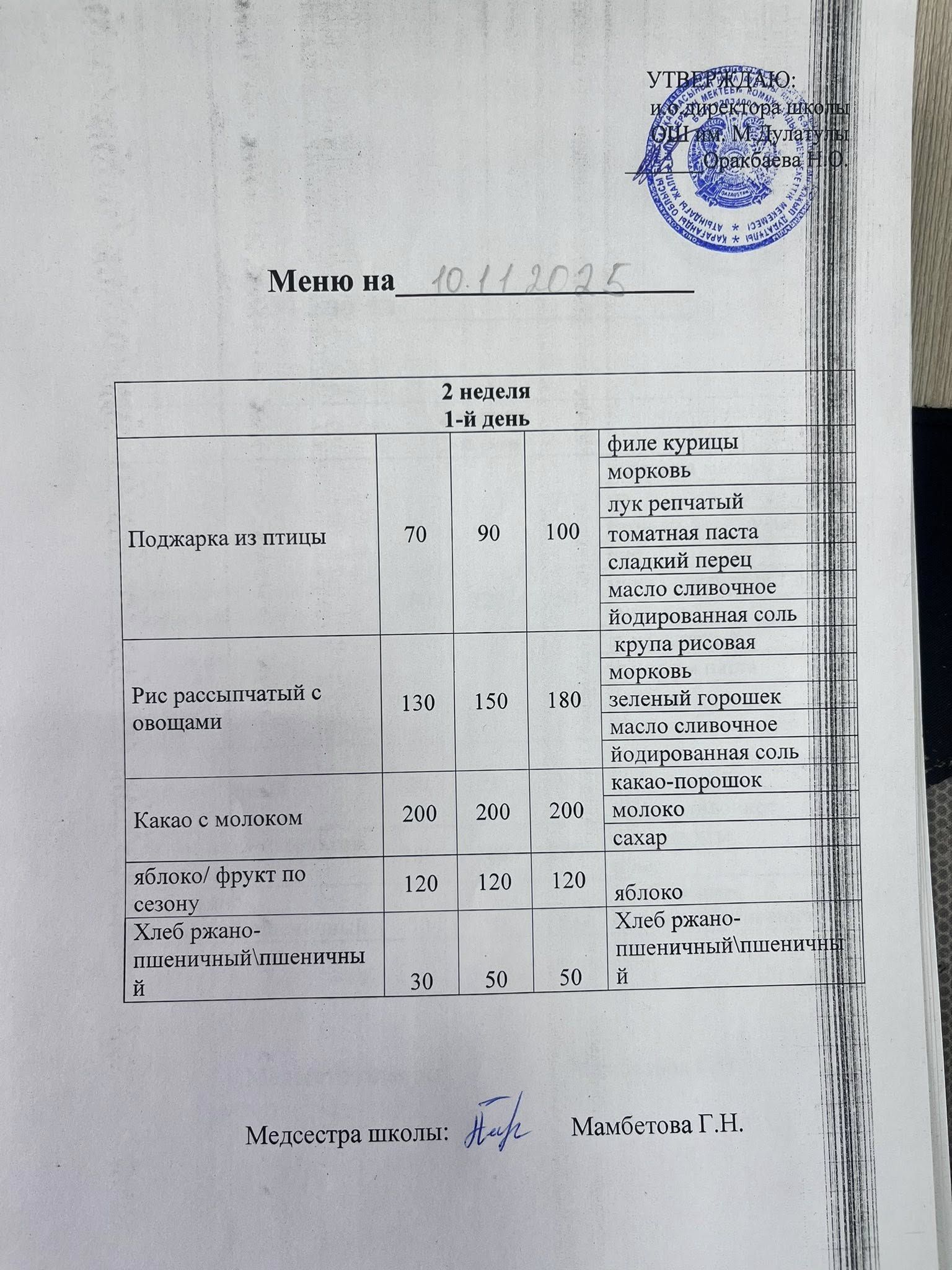 2025 жылдың 10 қараша күні мектеп оқушыларына арналған күнделікті тамақтану рационы төмендегідей ұйымдастырылды.