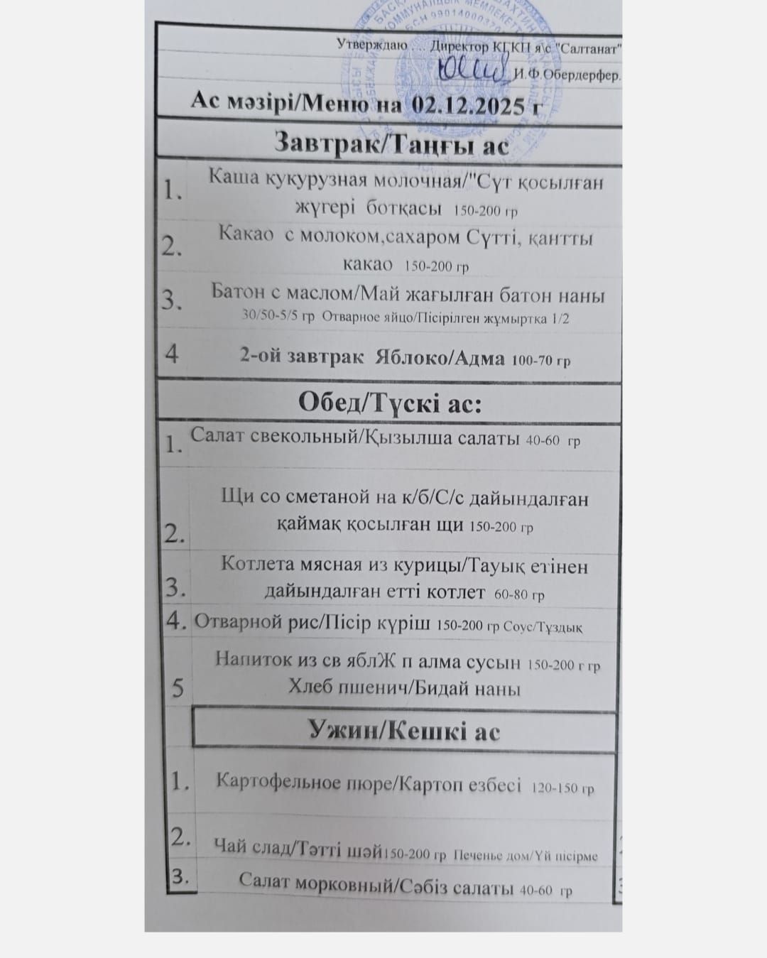 02.12.2025 жылға арналған тамақтану сомасы: 3 жасқа дейінгі бір балаға - 652.05 теңге; 3 жастан 6 жасқа дейінгі бір балаға - 729.08 теңге