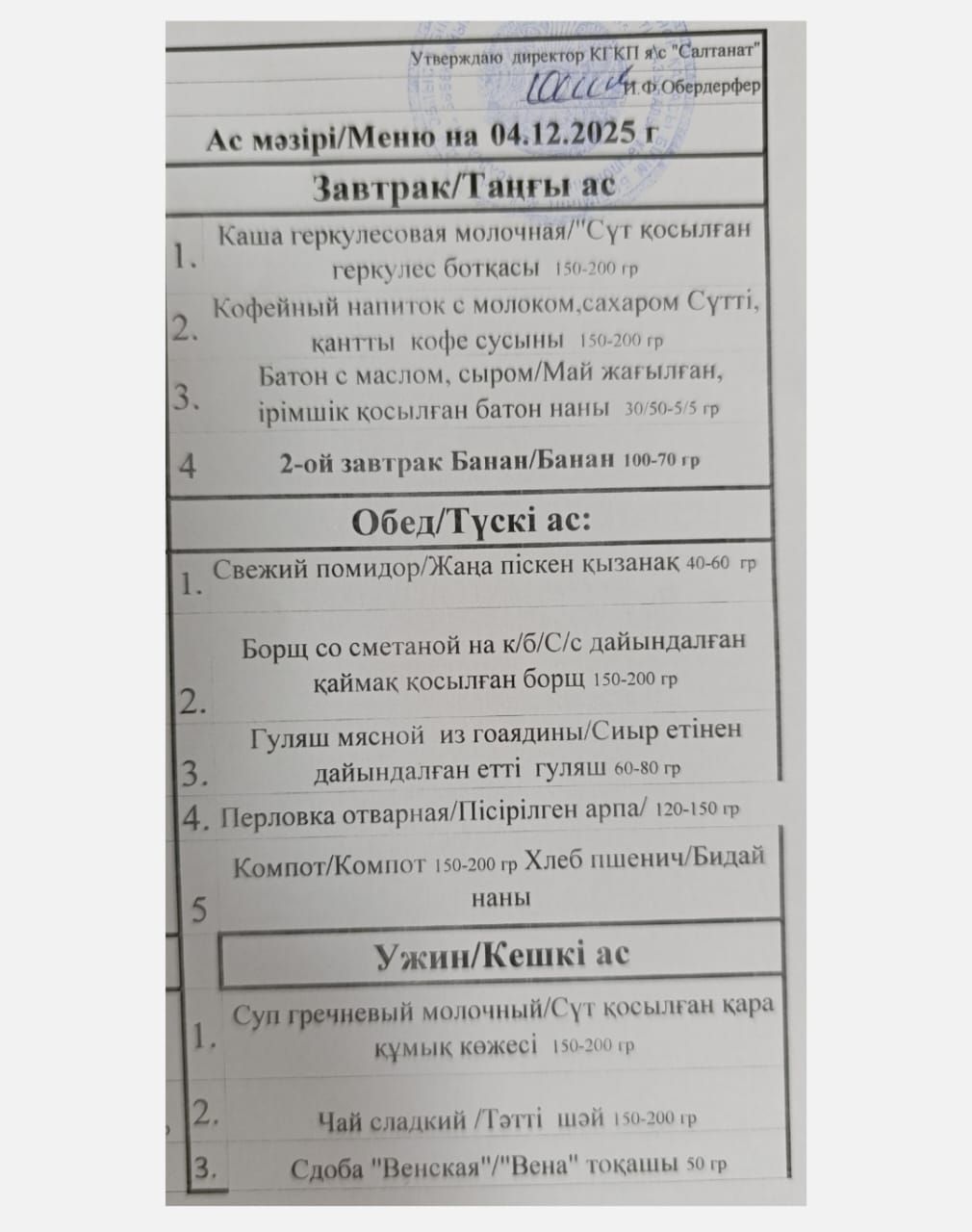 04.12.2025 жылға арналған тамақтану сомасы: 3 жасқа дейінгі бір балаға - 964.72 теңге; 3 жастан 6 жасқа дейінгі бір балаға - 1091.54 теңге