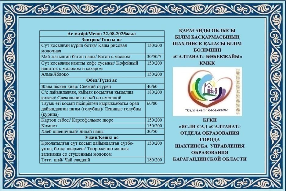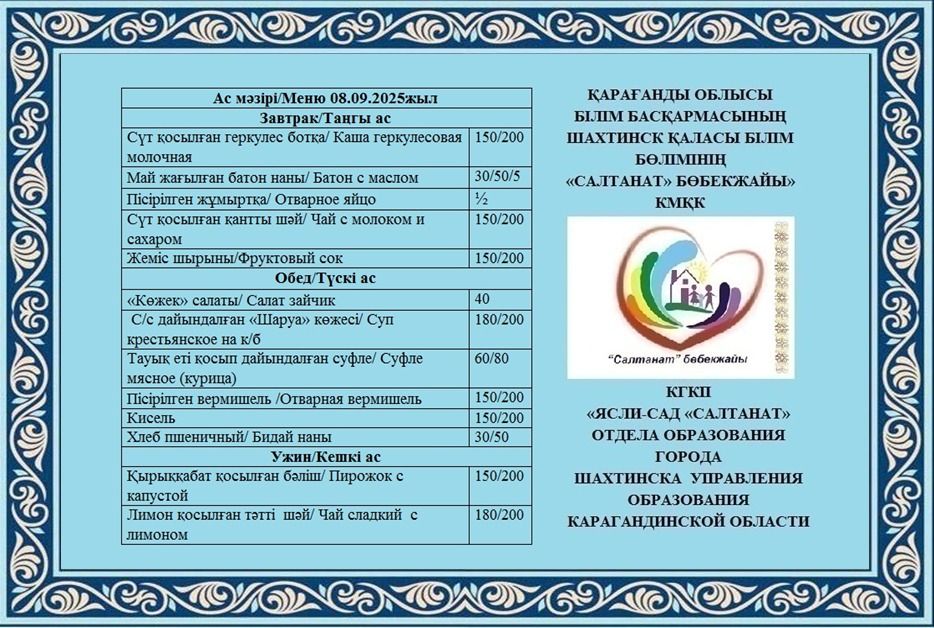 08.09.2025 жылға арналған тамақтану сомасы: 3 жасқа дейінгі бір балаға - 550.92 теңге; 3 жастан 6 жасқа дейінгі бір балаға - 621.04 теңге