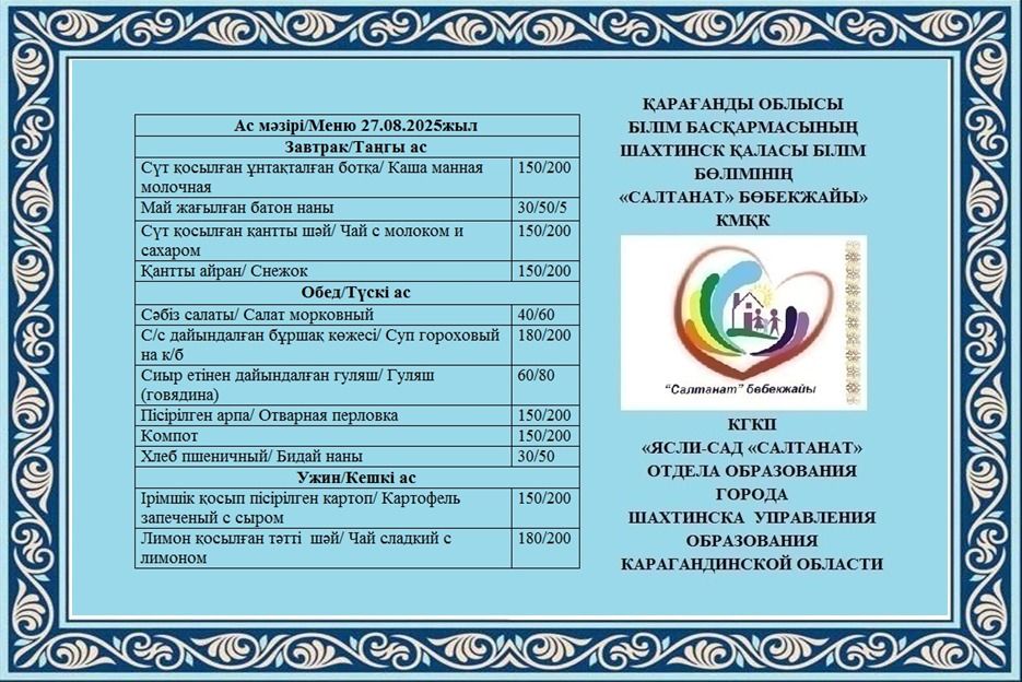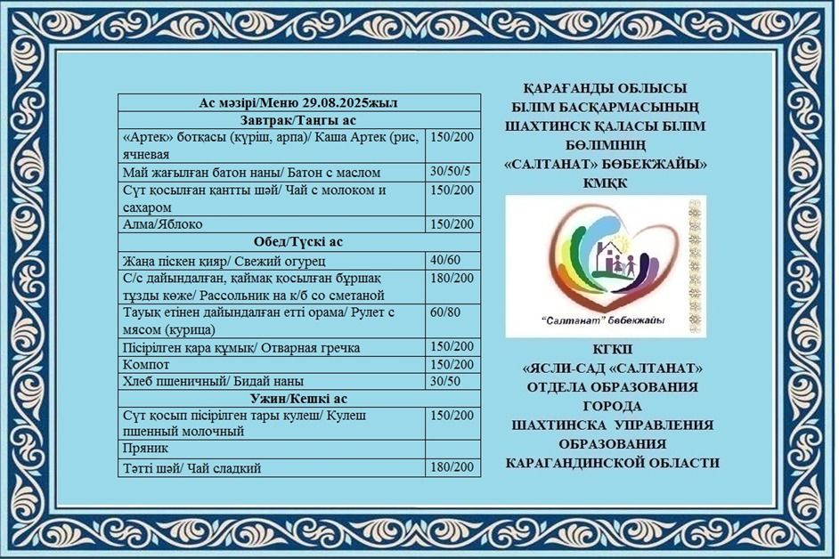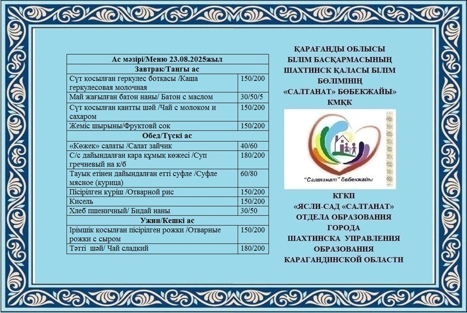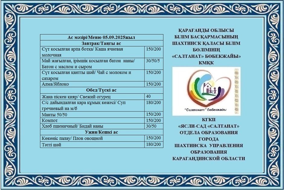 05.09.2025 жылға арналған тамақтану сомасы: 3 жасқа дейінгі бір балаға - 618.99 теңге; 3 жастан 6 жасқа дейінгі бір балаға - 706.64 теңге