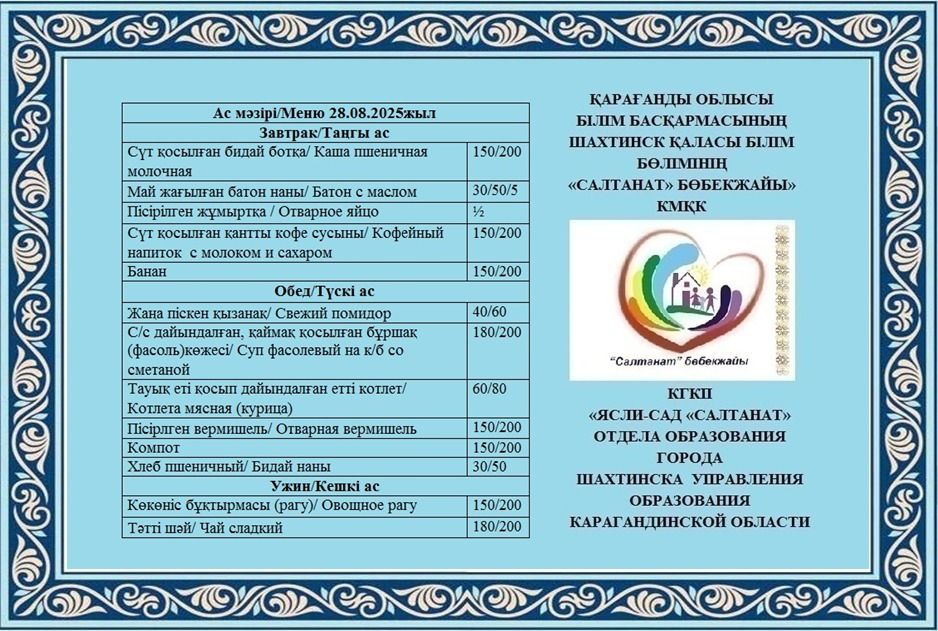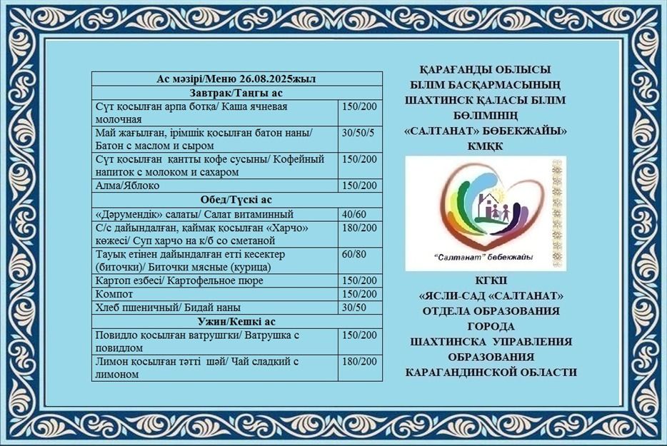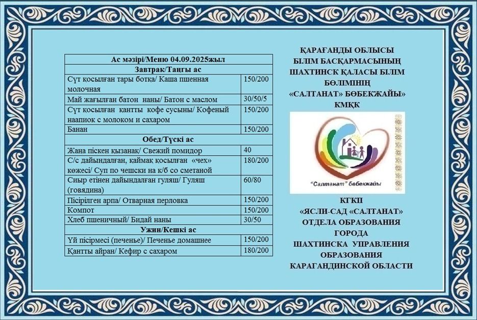 04.09.2025 жылға арналған тамақтану сомасы: 3 жасқа дейінгі бір балаға - 856.53 теңге; 3 жастан 6 жасқа дейінгі бір балаға - 940.14 теңге