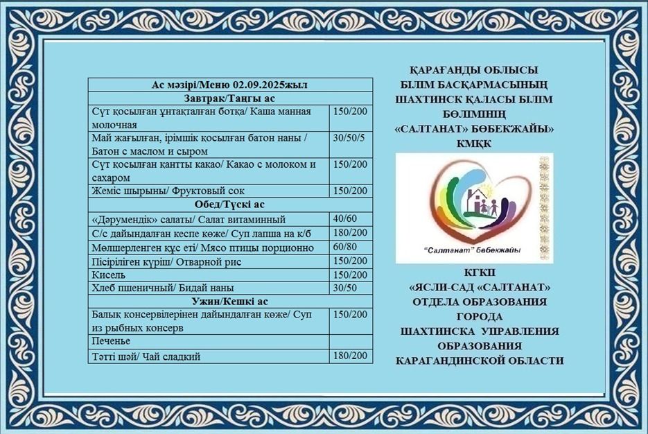 02.09.2025 жылға арналған тамақтану сомасы: 3 жасқа дейінгі бір балаға - 550.30 теңге; 3 жастан 6 жасқа дейінгі бір балаға - 681.78 теңге