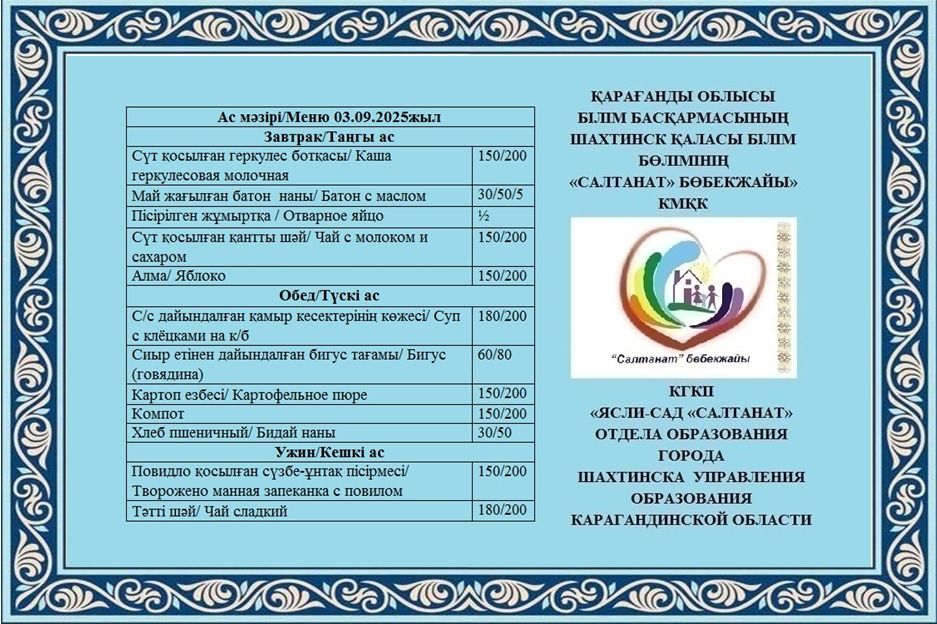 03.09.2025 жылға арналған тамақтану сомасы: 3 жасқа дейінгі бір балаға - 881.88 теңге; 3 жастан 6 жасқа дейінгі бір балаға - 1235 теңге