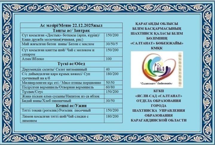 Сумма питания на 22.12.2025 составляет: на одного ребёнка до 3 лет - 516.69 тенге; на одного ребенка с 3 до 6 лет - 574.25 тенге