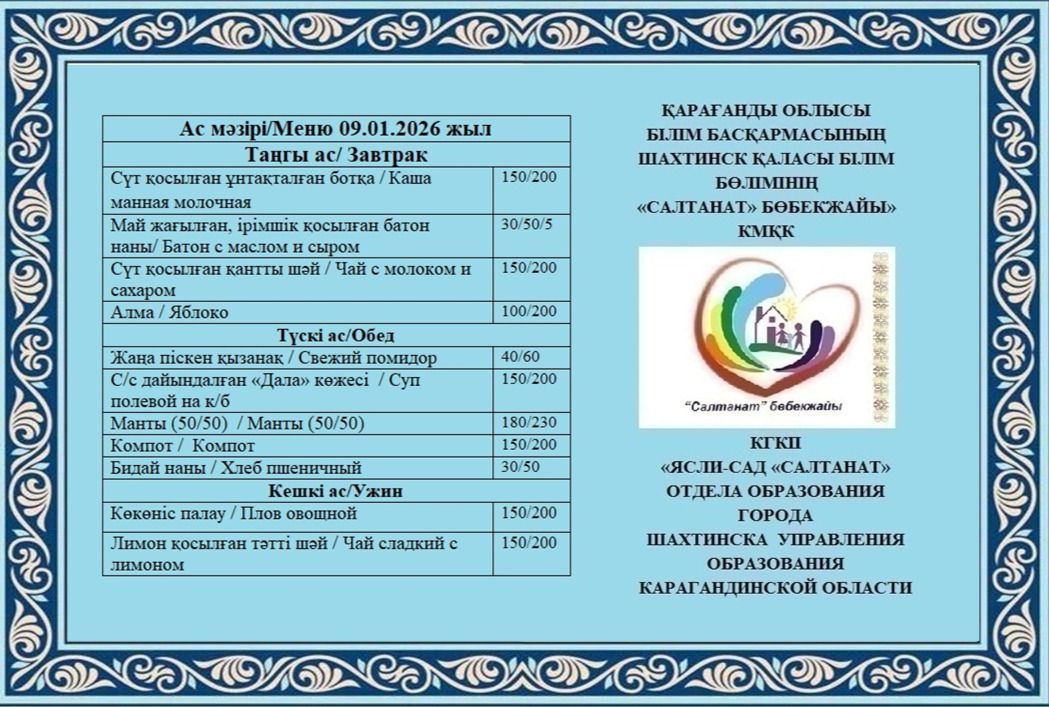 Сумма питания на 09.01.2026 составляет: на одного ребёнка до 3 лет - 660.46 тенге; на одного ребенка с 3 до 6 лет - 775.74 тенге
