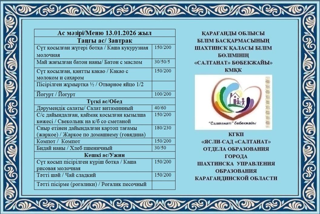 Сумма питания на 01.01.2026 составляет: на одного ребёнка до 3 лет - 990.17 тенге; на одного ребенка с 3 до 6 лет - 1104.13 тенге