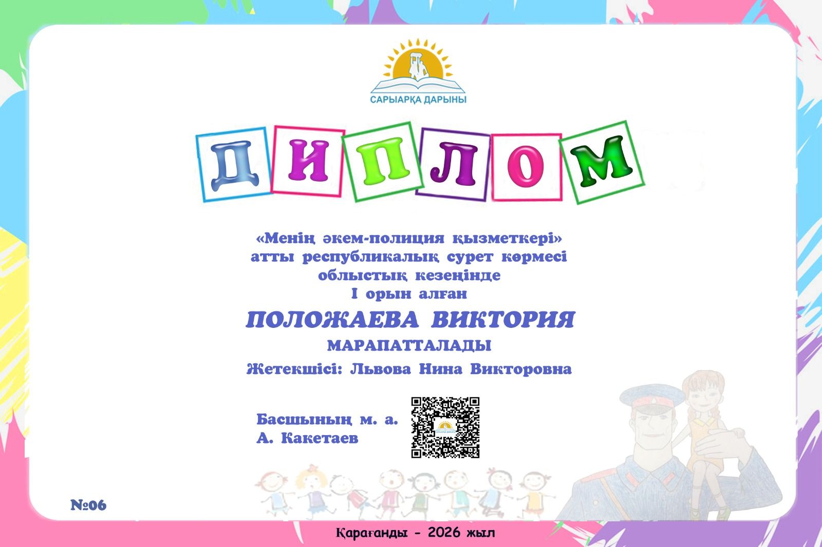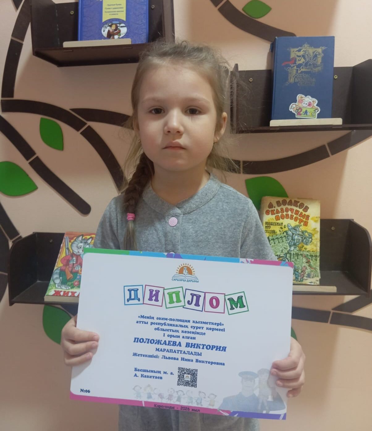 «Жұлдыз» тобының тәрбиеленушісі Виктория Положаеваны «Менің әкем – полиция қызметкері» байқауының Республикалық сурет байқауының облыстық кезеңінде лайықты бірінші орын…