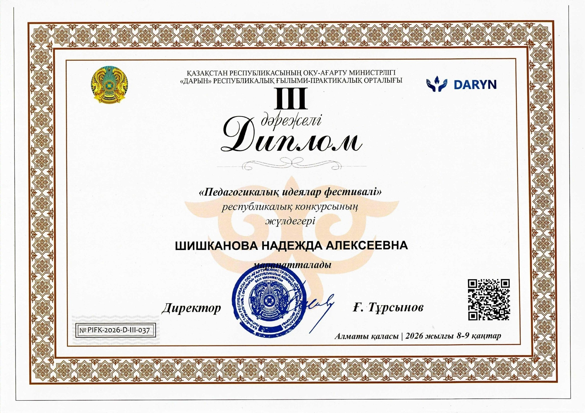 Педагог-логопед И. С. Аушева Республикалық «Педагогикалық идеялар панорамасы» байқауында 3 орын алғаны үшін дипломмен марапатталды.