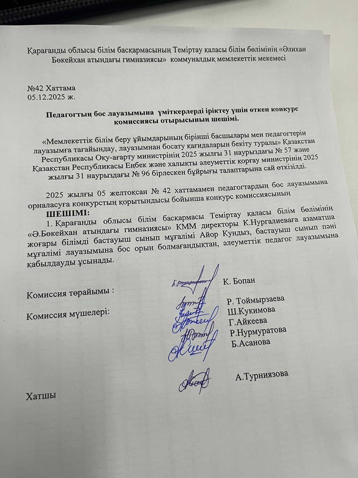 2025 жылғы 05 желтоқсан № 42 хаттамамен педагогтардың бос лауазымына орналасуға конкурстың қорытындысы бойынша конкурс комиссиясының