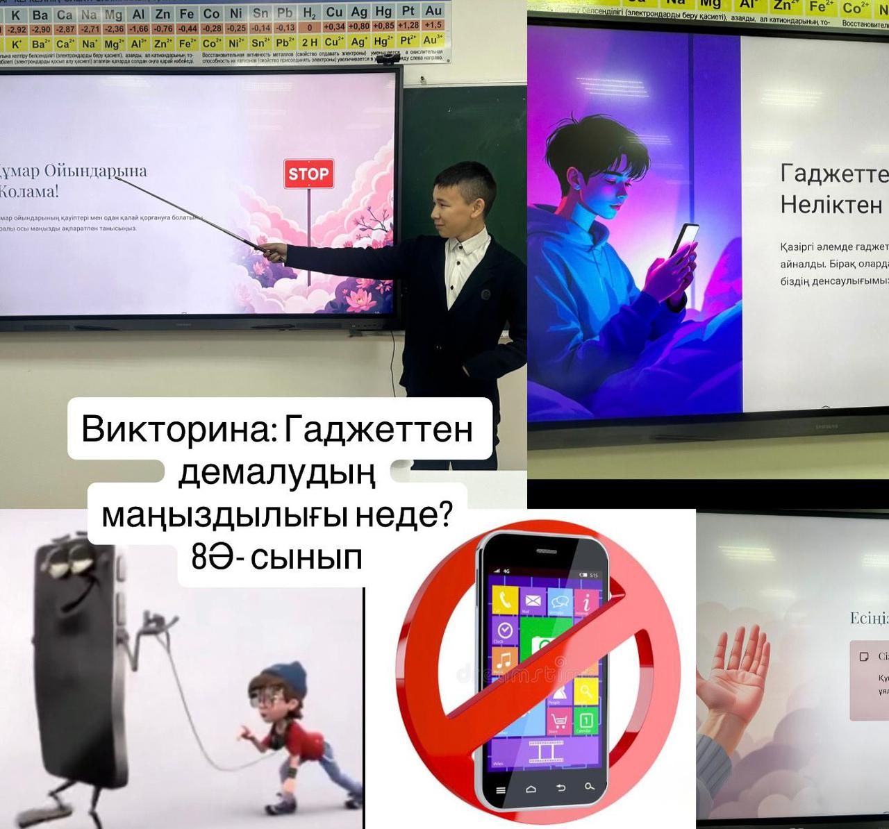 Мақсаты: гаджеттерді шамадан тыс қолданудың денсаулық пен даму процесіне әсері туралы оқушылардың хабардарлығын арттыру, қауіпсіз және жауапты цифрлық мінез-құлық дағдыларын қалыптастыру, сондай-ақ цифрлық құрылғыларсыз пайдалы бос уақыттың балама түрлерін насихаттау. В  рамках   ШСУЗ  «Саламатты  Мектеп» 24 ноября 2025г.стартовала «Неделя без гаджетов» среди  обучающихся  8- х кл. была проведена  викторина «Почему важно отдыхать от гаджетов?». Цель: повышение осознанности обучающихся о влиянии чрезмерного использования гаджетов на здоровье и развитие, формирование навыков ответственного и безопасного цифрового поведения, а также продвижение альтернативных форм полезного досуга без цифровых устройств.        k_amanzholov_osh_k_Adal_Azamat_СаламаттыМектеп