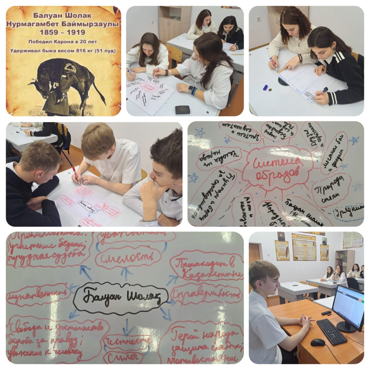 28.11.25 года в 10Б классе ОШ имени Карима Мынбаева было проведено занятие по пректу "Читающая школа " по произведению Сабита Муканова "Балуан Шолак ". Учащиеся читали отрывки из произведения и,  разделившись на группы, провели анализ.Тему анализа определили, вытянув  карточку . Каждая группа, обсудив свою тему, создала постер "Система образов", " Тема, идея и проблема повести", "Балуан Шолак". В конце занятия провели рефлексию и пришли к выводу, что повесть " Балуан Шолак " не только о легендарных подвигах батыра, но и о глубокой личной жизни борца за справедливость.
