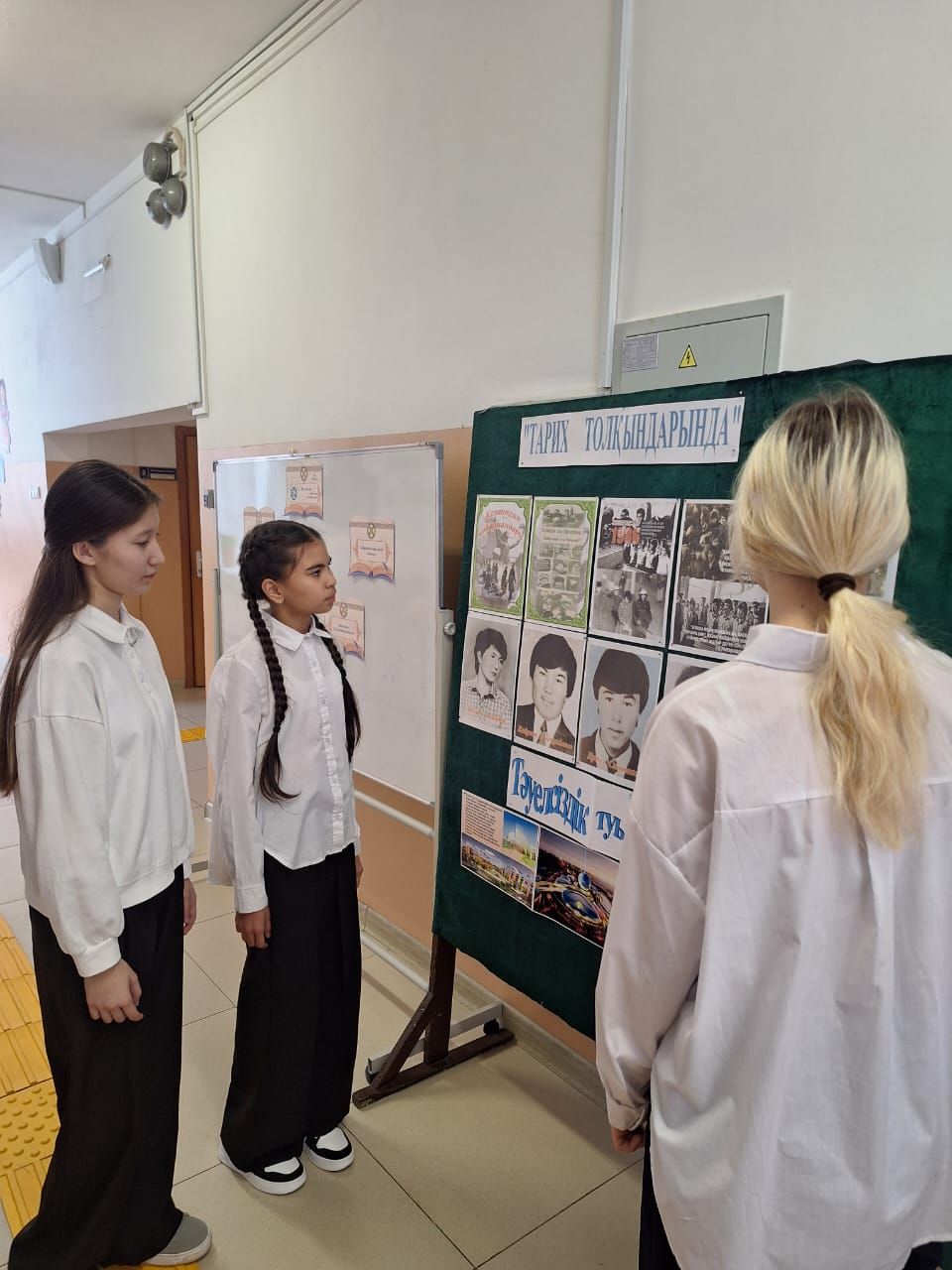 «Тарих толқынында» тарихи сауаттылық апталығы аясында мектепте ақпараттық стенд ұйымдастырылып, оқушылар назарына ұсынылды. Стендте Қазақстан тарихындағы маңызды кезеңдер, Тәуелсіздікке қол жеткізу жолындағы тарихи оқиғалар, сондай-ақ ел есінде қалған тұлғалар туралы фотосуреттер мен деректі материалдар орналастырылды.
