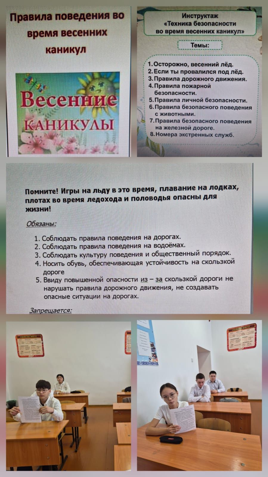16.03.2026 года в ОШ имени К.Мынбаева в 9"Б" классе, классный руководитель Есенова Г.К, провела инструктаж по технике безопасностей детей во время весенних каникул.Цель: во время весенних каникул  все учащиеся должны соблюдать ТБ. Учащиеся ознакомилися с правилами  ТБ во время весенних каникулах, просмотрели видеопрезентации о паводках.