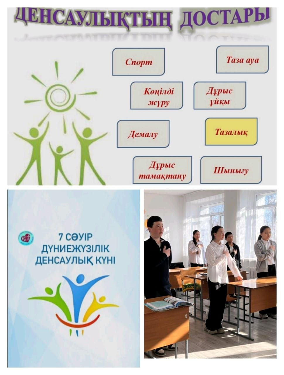 6 сәуір күні "Ахмет Байтұрсынұлы атындағы тірек мектебі (РО)" КММ -нің 8,10 қазақ сыныптары мен 7-сәуір Дүниежүзілік денсаулық күні "Өмірге салауатты қадам" - тақырыбында сынып сағаты өткізілді.Сынып сағатының соңында қауіпсіздік сабағы қамтылды.