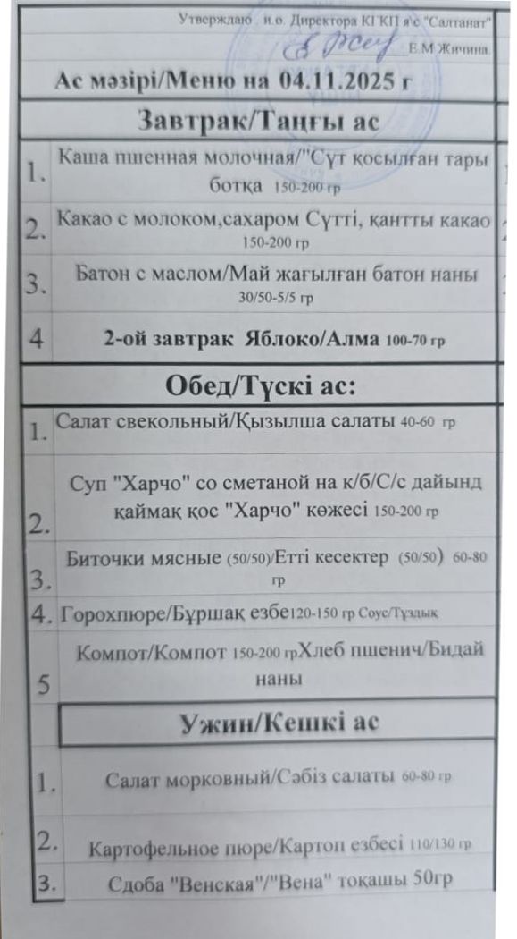 03.11.2025 жылға арналған тамақтану сомасы: 3 жасқа дейінгі бір балаға - 683.03 теңге; 3 жастан 6 жасқа дейінгі бір балаға - 777.95 теңге