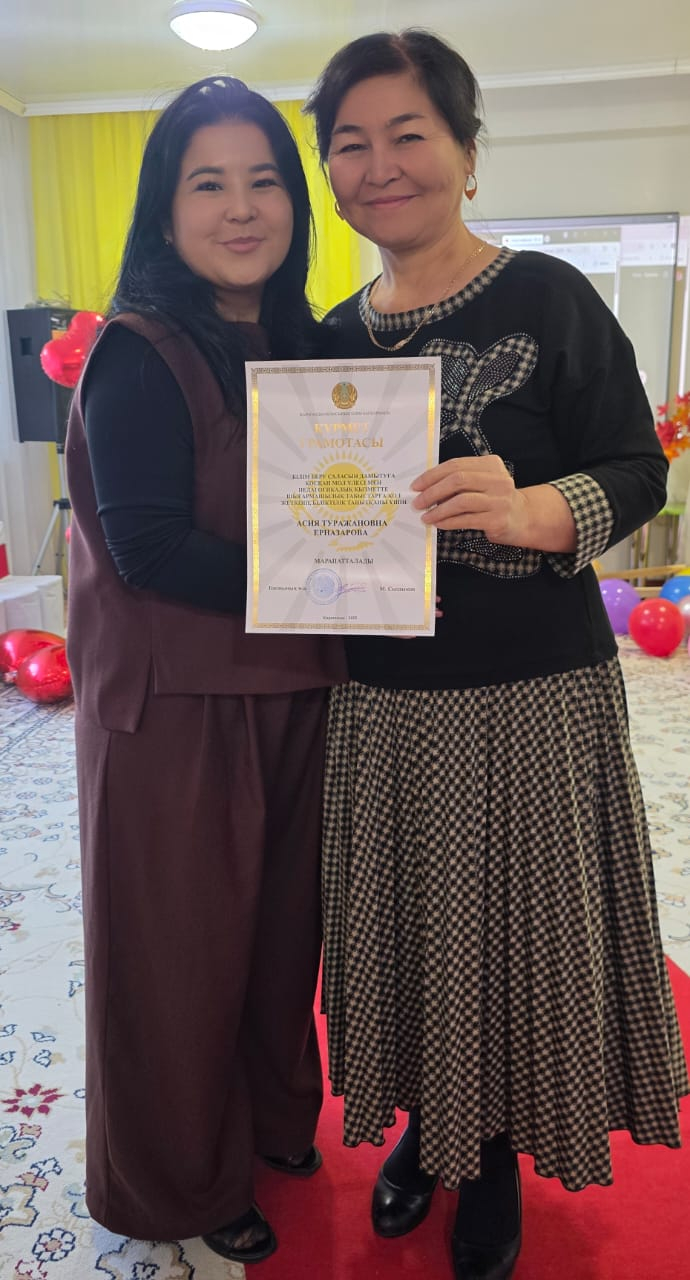 «Почетной грамотой» За большой вклад в развитие сферы образования, достижение творческих успехов и повышение квалификации награждается воспитатель ясли-сада «Еркетай» Ерназарова Асия Турежановна.