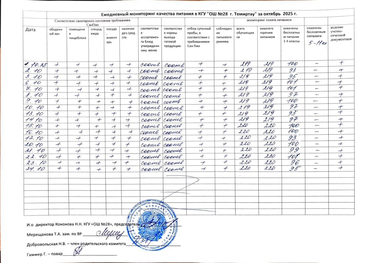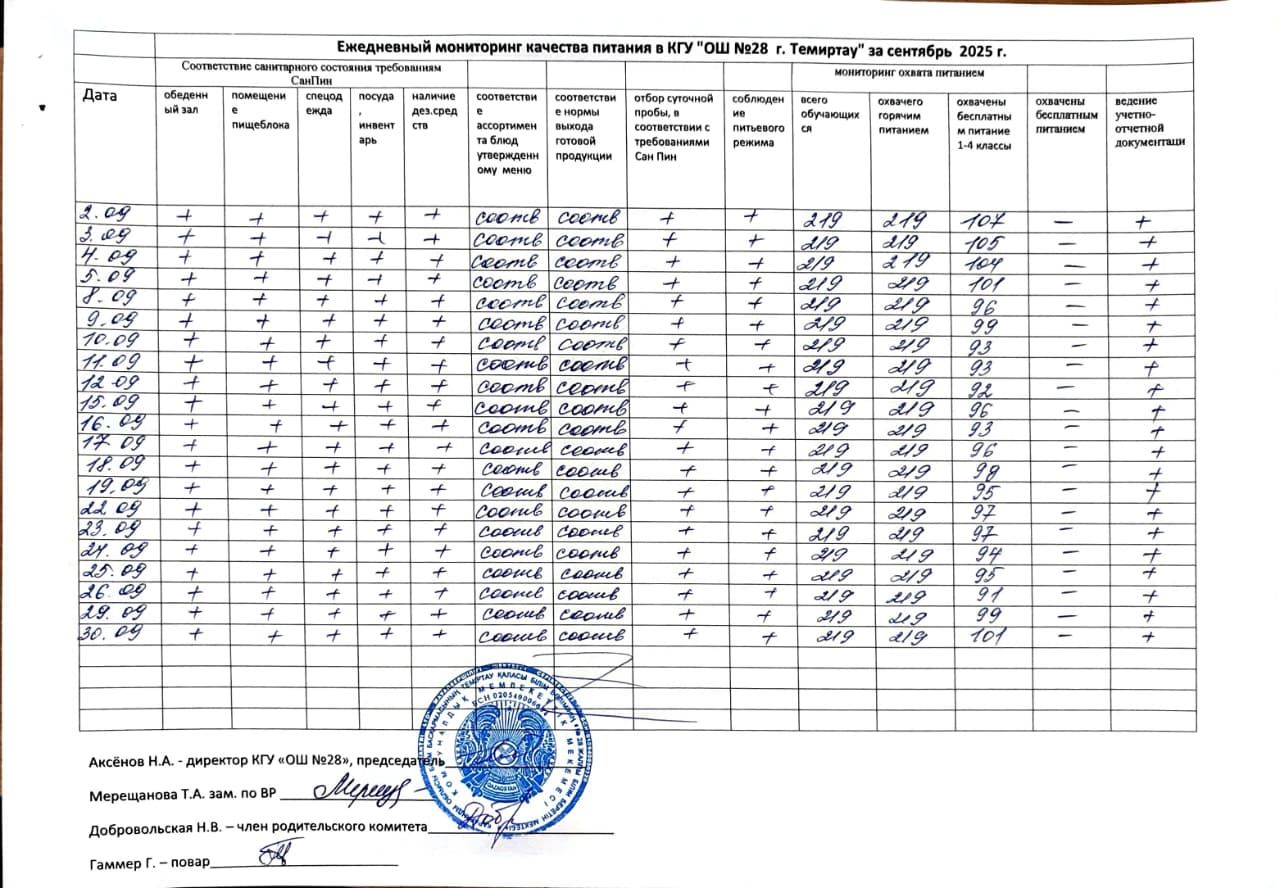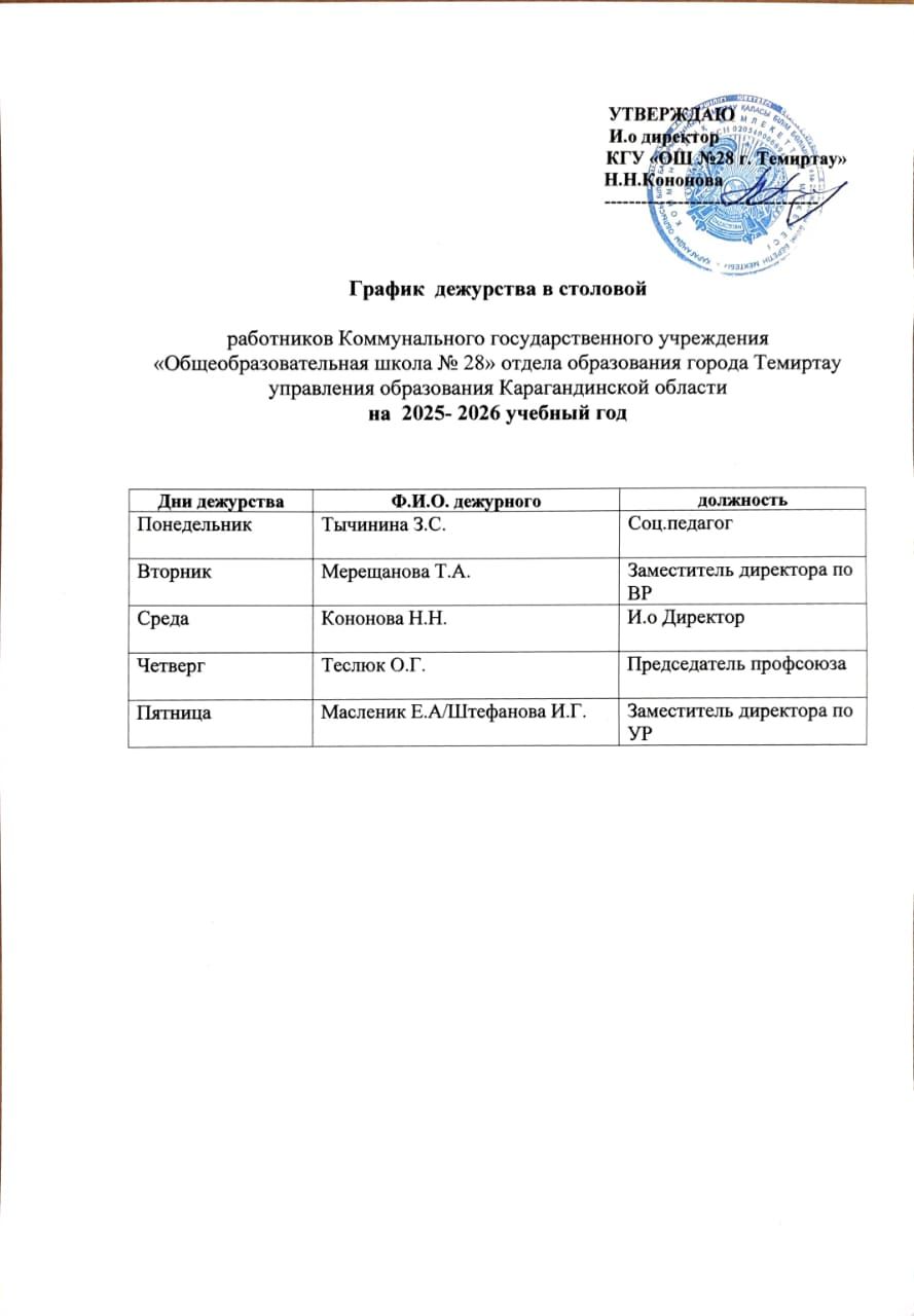 График дежурства в столовой на 2025-2026 учебный год