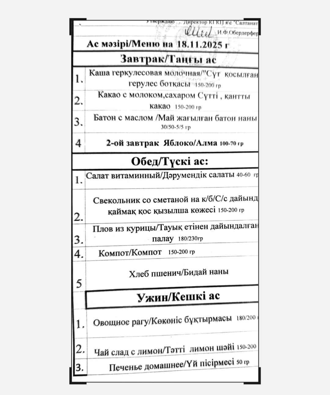 18.11.2025 жылға арналған тамақтану сомасы: 3 жасқа дейінгі бір балаға - 595.83 теңге; 3 жастан 6 жасқа дейінгі бір балаға - 672.58 теңге
