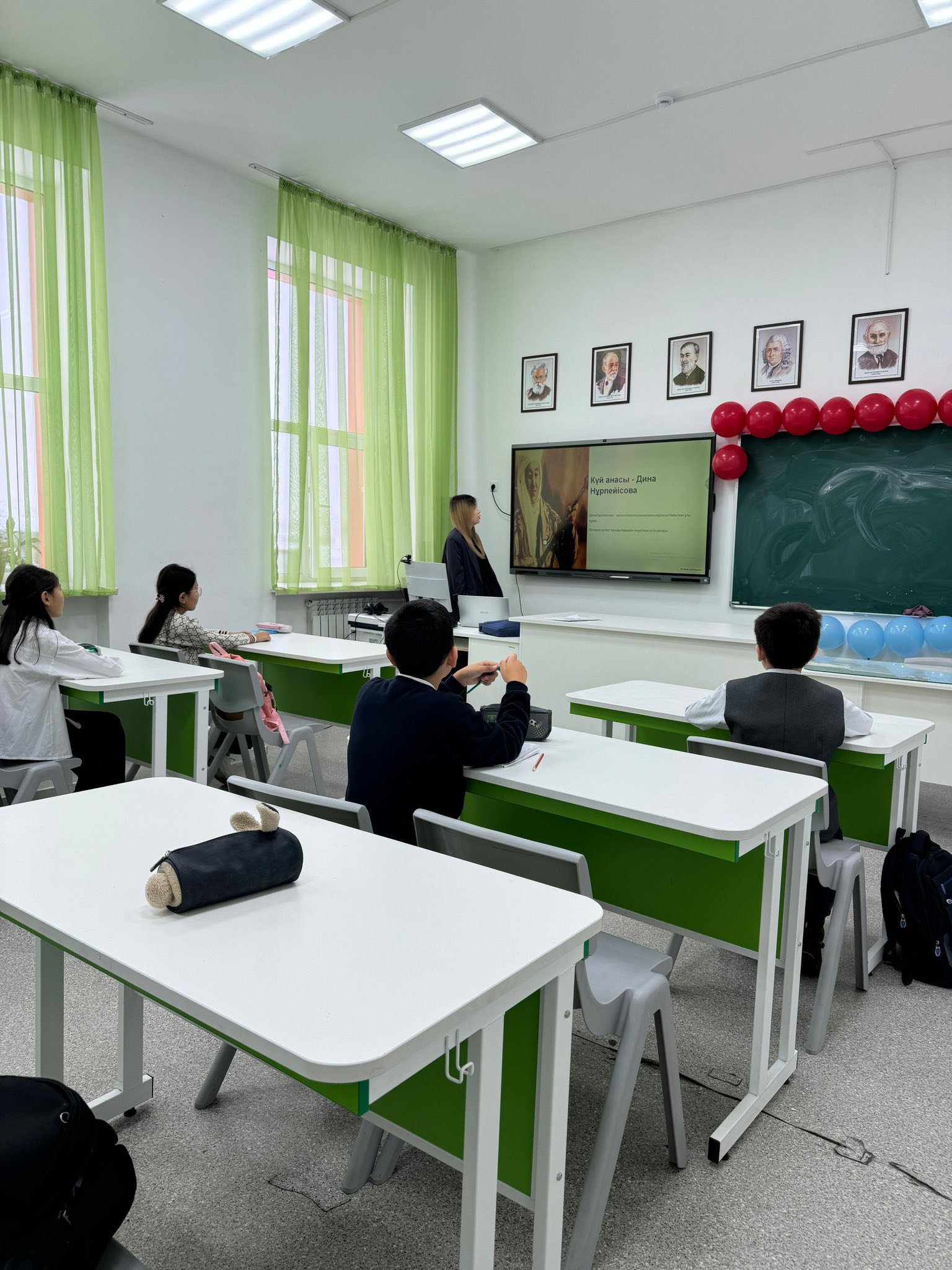 Тарихи сауаттылық апталығы аясында 5–6 сыныптарда «Дина Нұрпейісова – дәуірдің дауысы» тақырыбында сынып сағаты өткізілді.