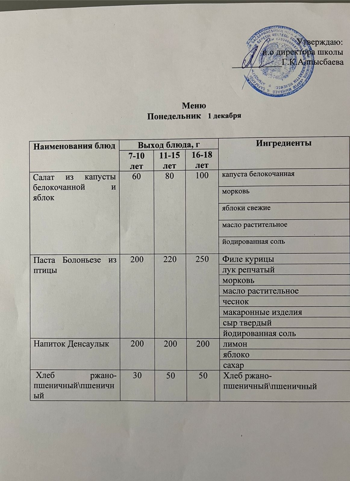 2025 жылдың 10 қараша күні мектеп оқушыларына арналған күнделікті тамақтану рационы төмендегідей ұйымдастырылды.