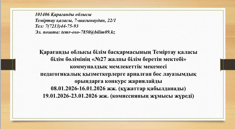 Организации> Карағанды облысы білім басқармасының Теміртау қаласы білім бөлімінің «№27 жалпы білім беретін мектебі» КММ