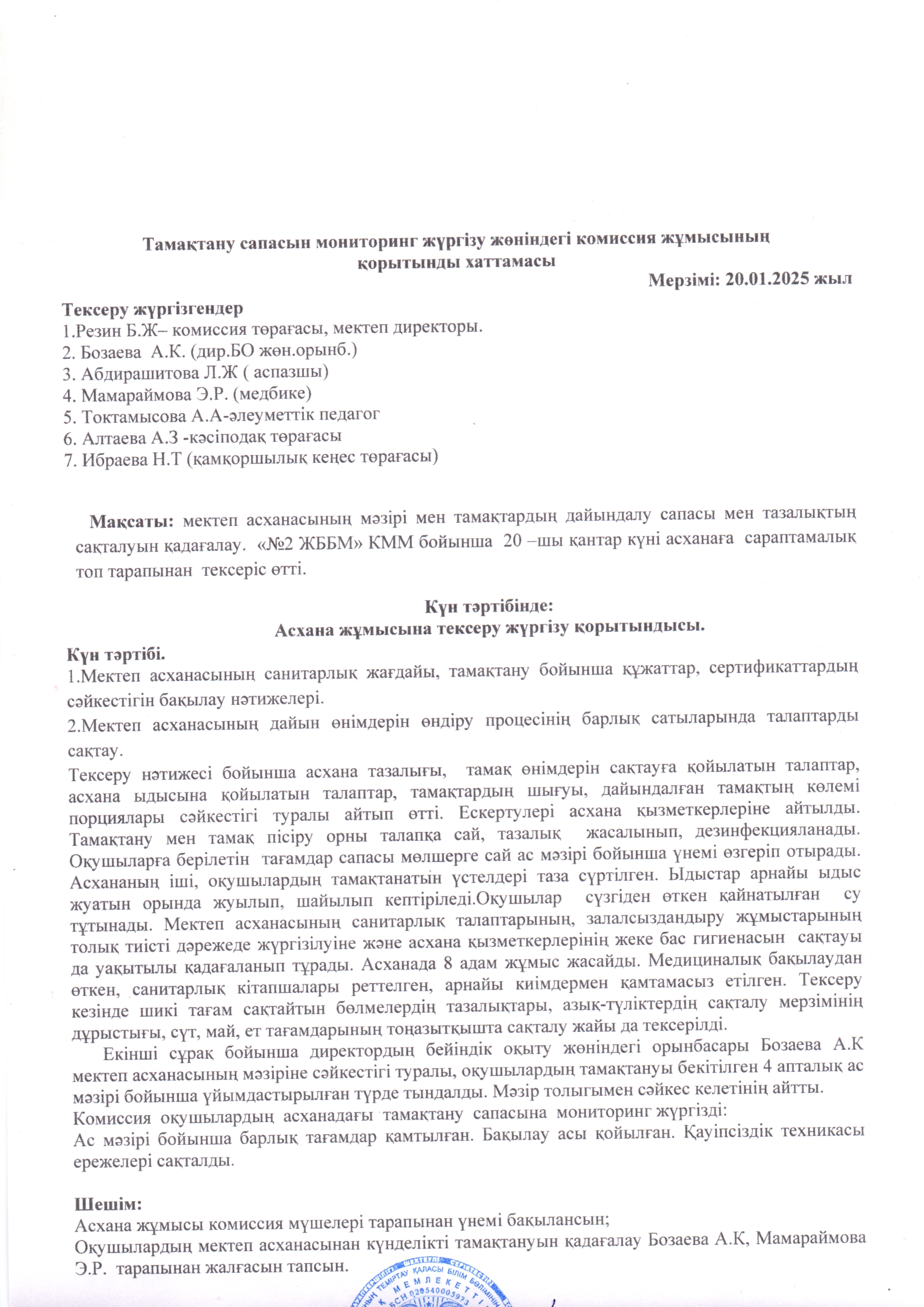 Тамақтану сапасын бақылау жөніндегі ведомствоаралық сараптау тобының актісіТамақтану сапасын бақылау жөніндегі ведомствоаралық сараптау тобының актісі |