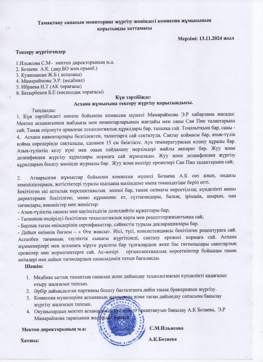 Тамақтану сапасын мониторинг жүргізу жөніндегі комиссия жұмысының қорытынды хаттамасыТамақтану сапасын мониторинг жүргізу жөніндегі комиссия жұмысының қорытынды хаттамасы. Қараша айы |