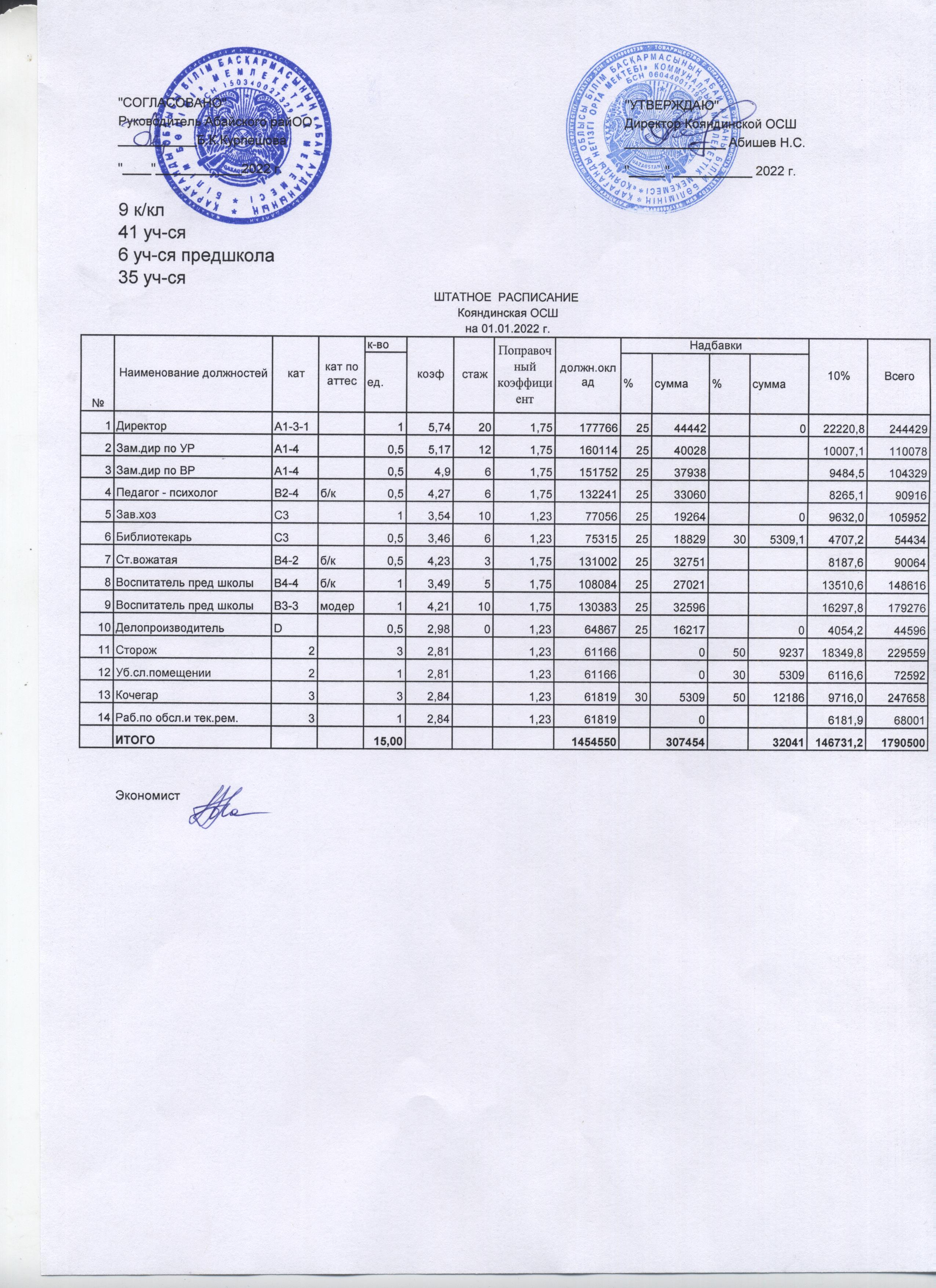 Штатное расписание КГУ"Кояндинская ОШ"