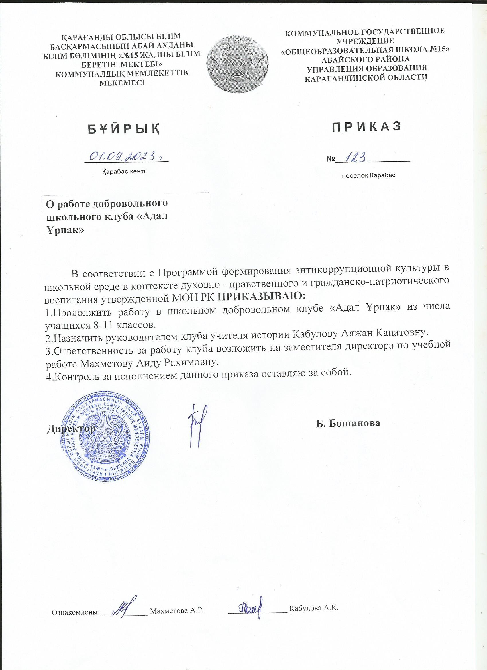 Бұйрық "ЖББМ №15" 01.09.2023 жыл"Адал Ұрпақ" ерікті мектеп клубының жұмысы туралы |