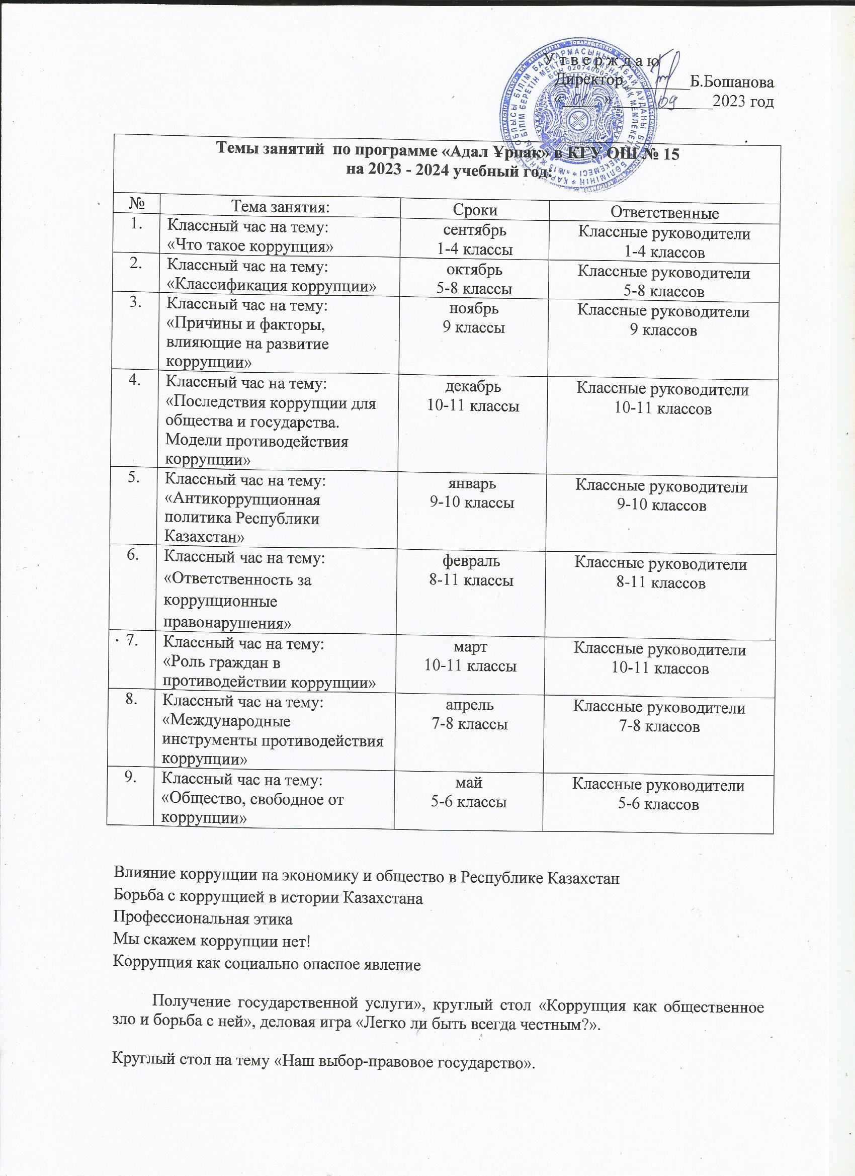 КГУ ОШ №15 Темы занятий "Адал Ұрпақ" на 2023-2024 учебный годТемы занятий по программе "Адал Ұрпақ" в КГУ ОШ №15 на 2023-2024 учебный год. |