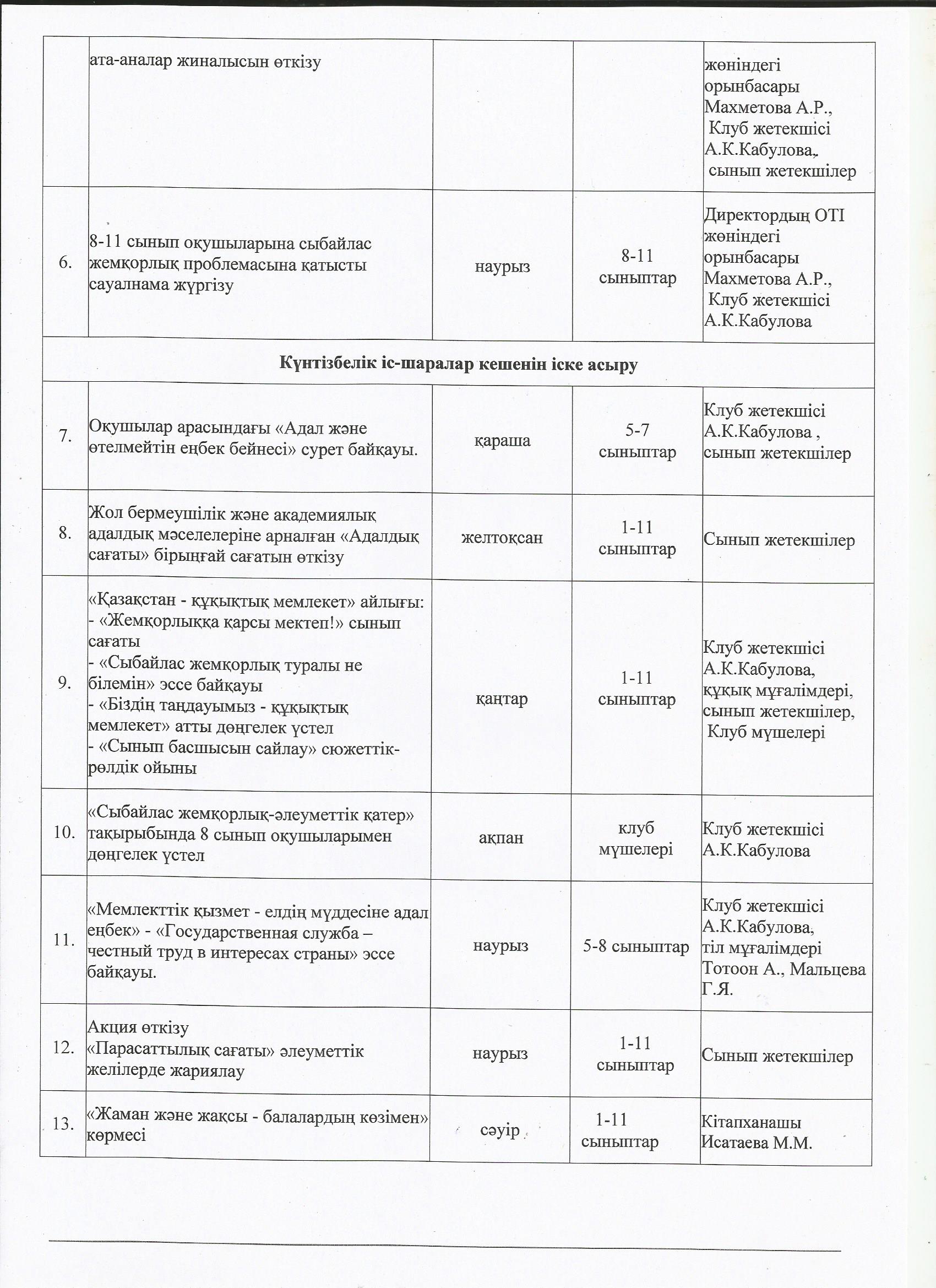 КГУ "ОШ №15" План работы "Адал Ұрпақ" на 2023-2024 учебный годПлан работы добровольного школьного клуба "Адал Ұрпақ" на 2023-2024 учебный год |