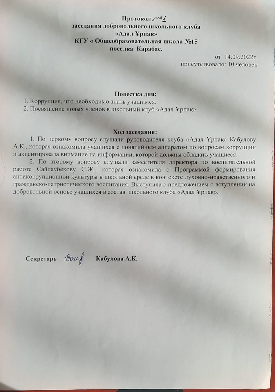 Протокол № 1Заседания добровольного школьного клуба "Адал Ұрпақ" |