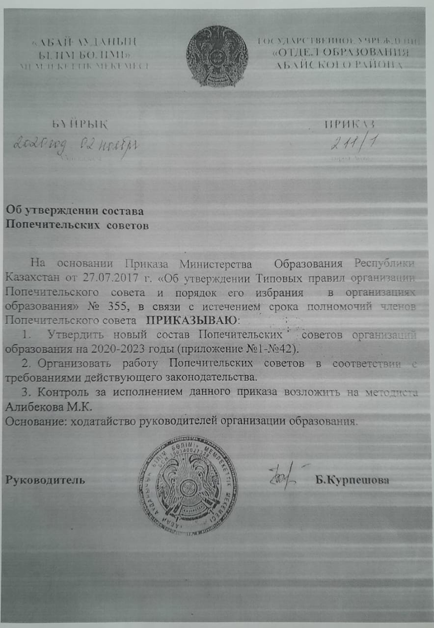 Приказ КГУ ОШ № 15Об утверждении состава Попечительского совета |