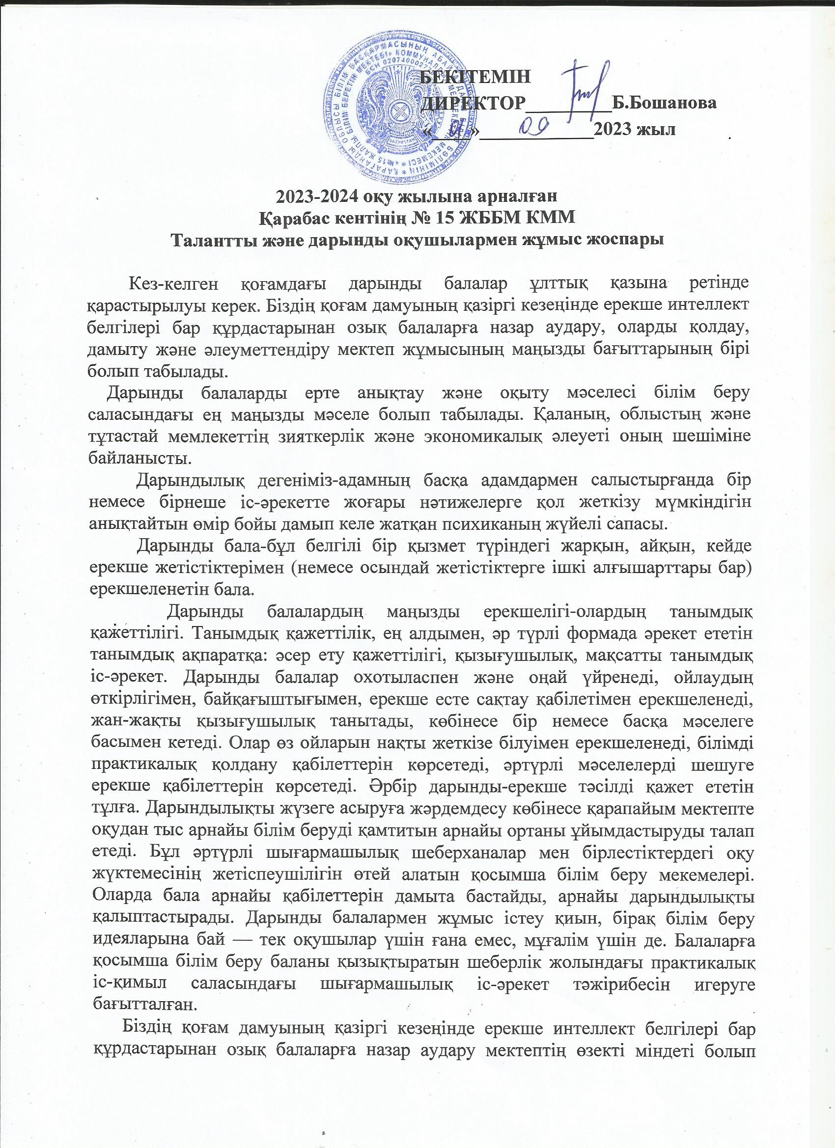 2023-2024 оқу жылына арналған Қарабас кентінің №15 ЖББМ КММ Талантты және дарынды оқушылармен жұмыс жоспары